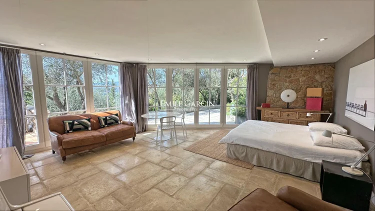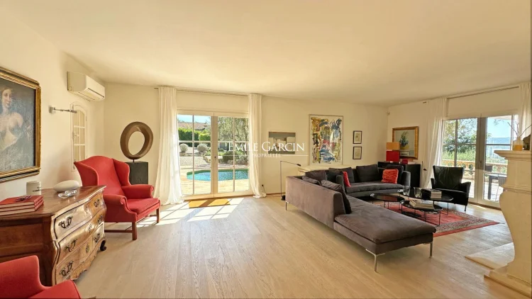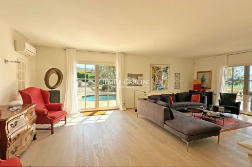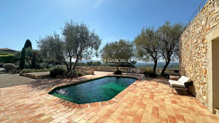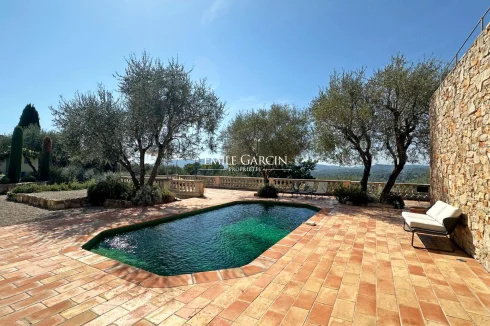 Located 5 minutes from Mougins, in peaceful surroundings, this property of approximately 260 sq.m has been the subject of a high-end renovation and is made available in perfect condition. Facing south and west, it is bathed in sunlight thanks to its large windows. Its hillside position affords commanding views of the surrounding hills. The ground floor comprises an entrance hall, a spacious living room of about 90sq.m with fireplace and wood-burning stove backing onto the swimming pool, a large modern equipped kitchen, a dining room, a utility room, a Wc and a second living room / master bedroom of approximately 30 sq.m (with adjoining shower room and Wc) opening onto another terrace. Upstairs, you will find three bedrooms (two of which have access to a magnificent terrace), plus a bathroom with toilet and a shower room. Each bedroom enjoys unobstructed views of the surrounding greenery and hills. There is an independent studio/office of approximately 25 sq.m, ideal for working remotely, and a chalet of approximately 20 sq.m at the bottom of the garden that can accommodate guests. Heated salt-water swimming pool. Outdoor dining area and shower. Pétanque area. Wine cellar. This is the perfect family home, close to the local schools and shops, with a spacious interior and stunning outdoor spaces.