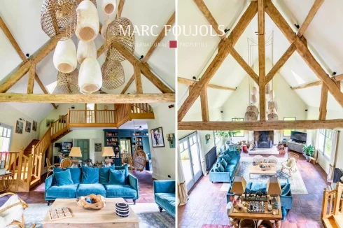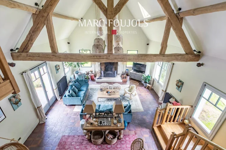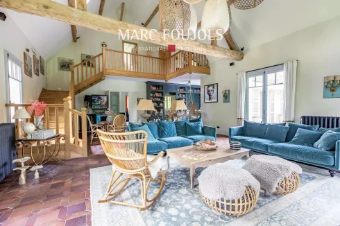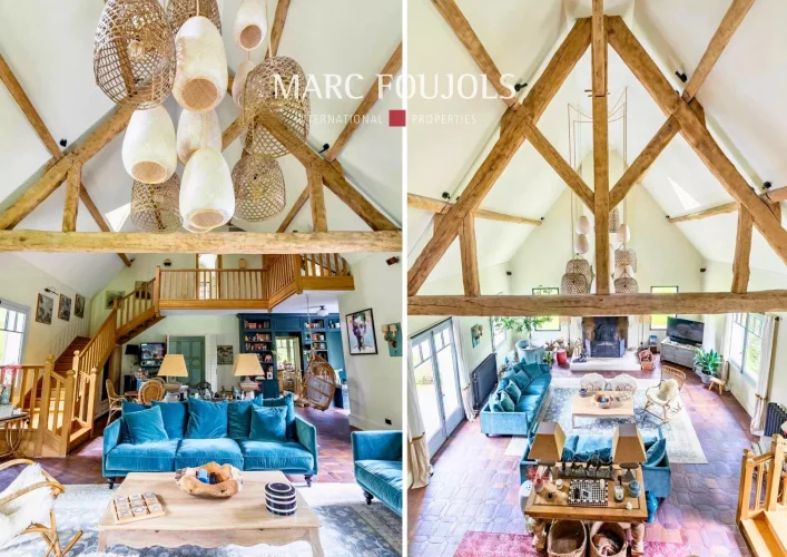 The ground floor seduces with its volumes and brightness: large entrance with cupboard, cathedral living room with fireplace, dining room also decorated with a fireplace, large convivial dining kitchen and a superb master suite.