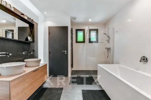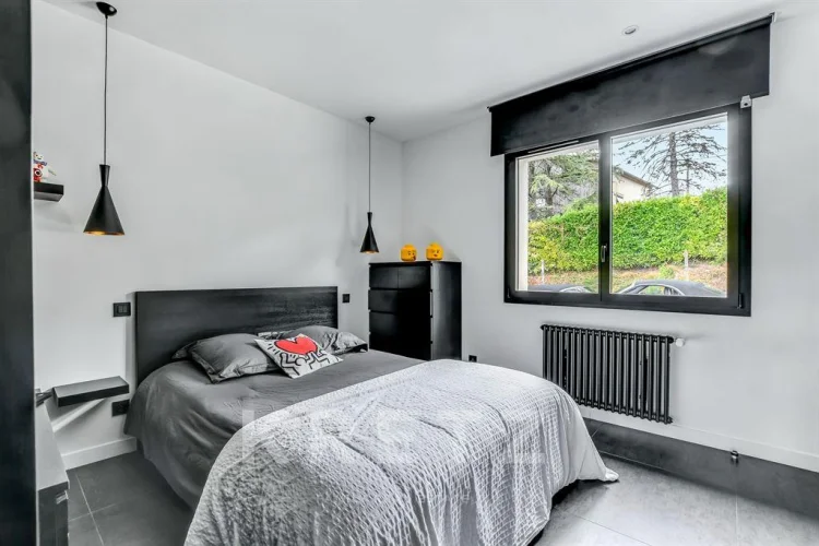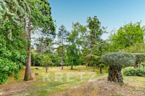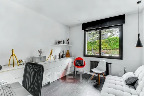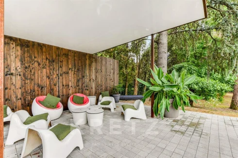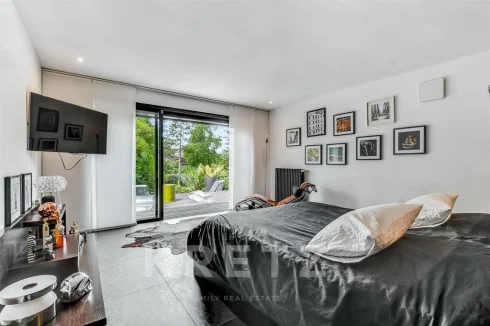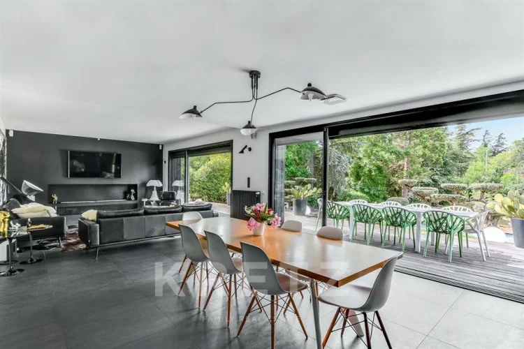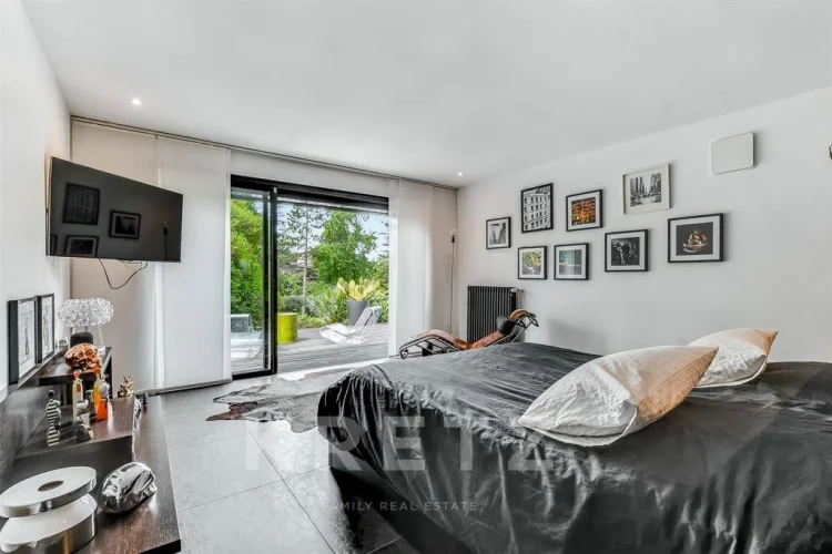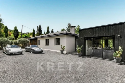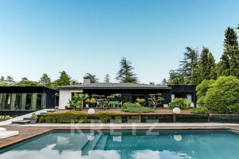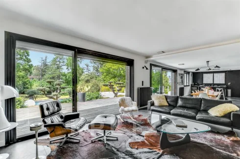 As soon as you enter, the staging is spectacular: a monumental off-axis door opens onto an 11 m² gallery that sets the tone. All on one level, the house deploys a large living room of 70 m² bathed in light, and a master suite of 57 m² with bathroom and dressing room, facing the garden.