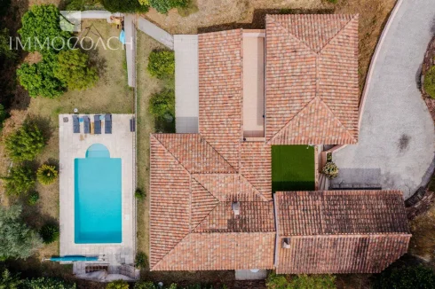 In a private gated estate in La Londe les Maures, on a plot of 1325 m², you will be charmed by this Provencal villa with uninterrupted views. Ground floor: large living/dining room with a central fireplace opening onto a large 56 m² terrace, semi-open plan kitchen, 2 large bedrooms with ensuite bathroom, large storage cupboards. Upstairs, 2 bedrooms opening onto a balcony with uninterrupted views, a shower room. An annexe, a storeroom/boiler room and a large garage complete this property. The south-facing 9x5 swimming pool enables you to benefit from the sun late into the day. .