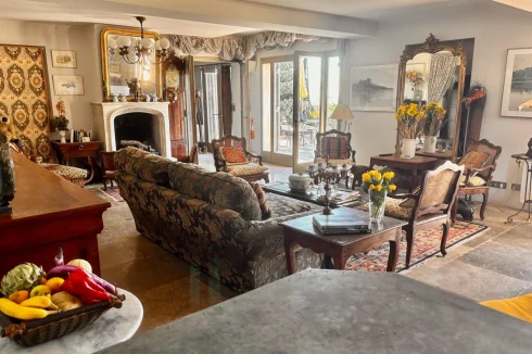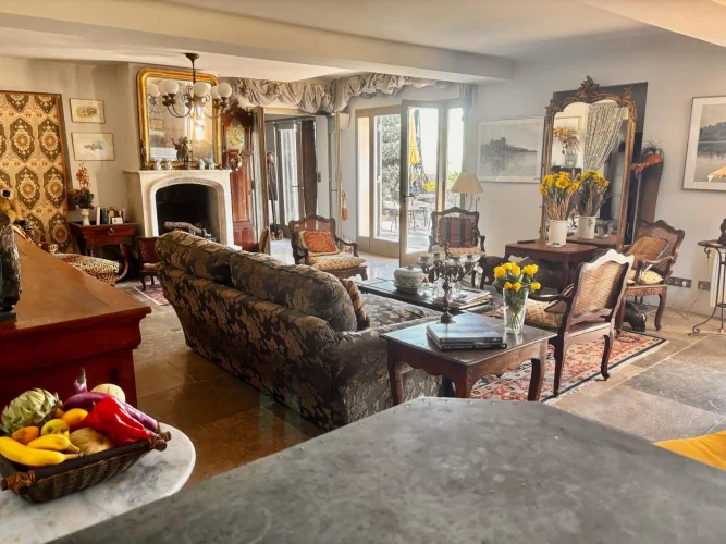 The ground floor comprises: large and luminous 56m² sitting room with dining area and handsome stone fireplace well-equipped adjoining kitchen with an island unit bedroom (currently used as a petit salon) with adjoining shower room separate WC.