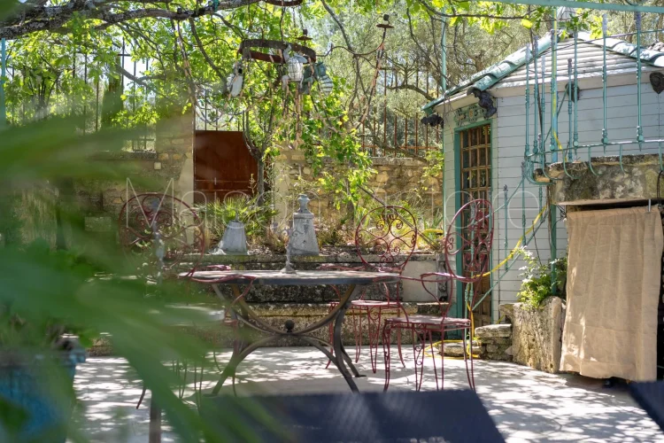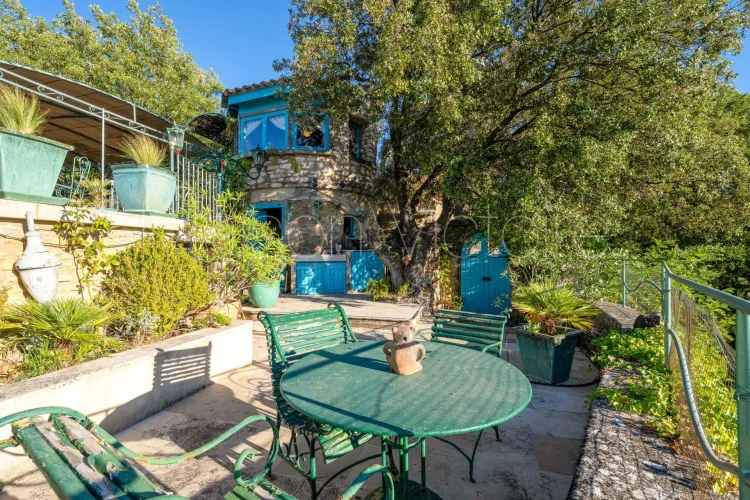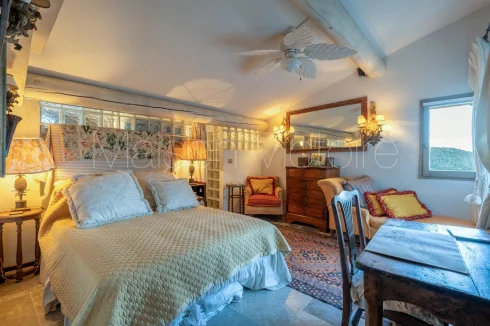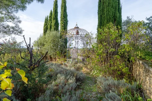 The carefully landscaped 0.15-acre garden, with a meandering path leading to a wrought-iron pavilion, is planted with a wonderful variety of trees and flowering plants. A spacious terrace runs along the front of the house, providing the ideal spot for outdoor dining and entertaining, with breathtaking views of the village below. The swimming pool is framed by a large sunbathing terrace.