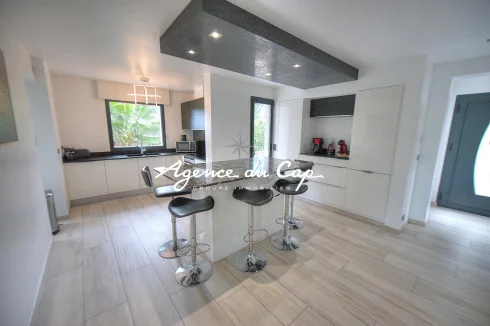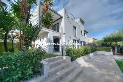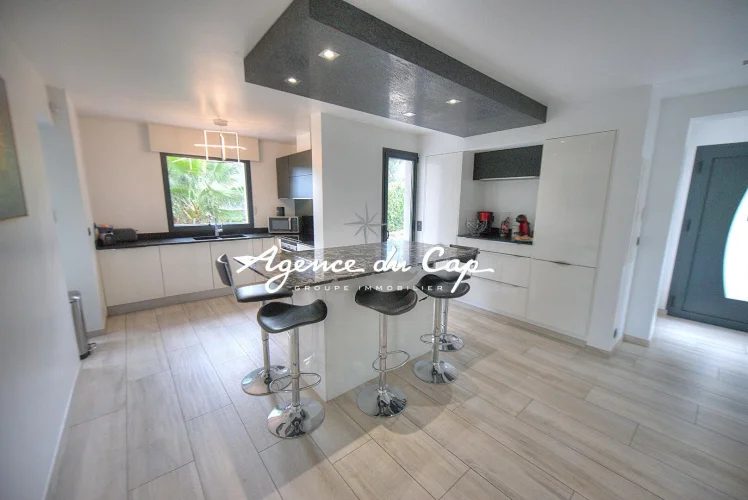 Exclusive. Beautiful contemporary, perfectly quiet, in a residential area of Fréjus. It develops on 250 m 2, a main part on one level, comprising: entrance and pantry, very generous fitted kitchen, a beautiful living room opening onto a terrace with a bioclimatic pergola, a master bedroom with shower room and dressing room. Upstairs, a landing leads to two bedrooms and a shower room. In the garden, a gym, a wine cellar and a beautiful room of about 30 m2. The villa is also completed with an independent 2-room apartment, with its terrace and jacuzzi. Ideal for entertaining. Its fully landscaped garden is embellished with a swimming pool, and a jacuzzi, benefits from numerous parking spaces and an electric garage. No work to be done.