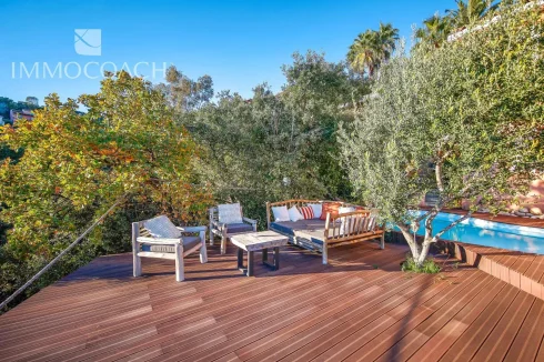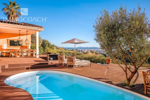 Located in a residential area close to the town centre and 10 mins drive to the beach, this 151 m² villa will charm you with its breathtaking view of the Bay of Hyères. Its summer kitchen and large decking are allowing you to enjoy the panoramic views and al fresco dining.