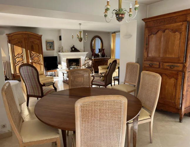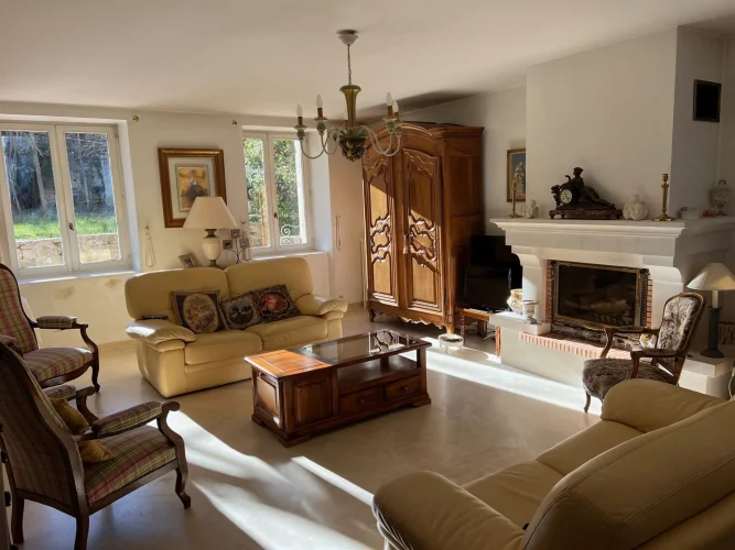 On the ground floor: A large entrance hall, a nice living space dining room living room with fireplace with a direct access to a large terrace to the south and the garden, a fitted kitchen and a pantry, a hallway, toilets , a large garage, the boiler room with oil central heating, a storage room, a wine cellar