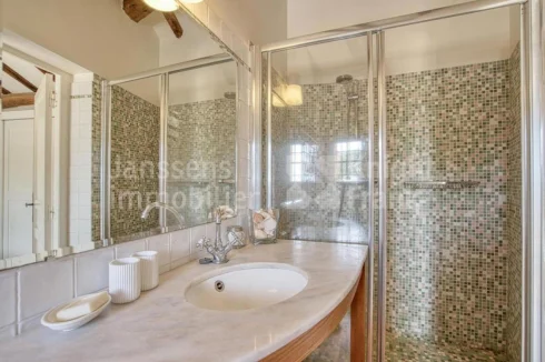 This Provençal villa is approx. 210 sqm in floor area and comprises, on the ground floor, an entrance hall, a spacious lounge/dining room with bookshelves, a separate kitchen, three bedrooms (each with its own shower room) and a guest toilet.