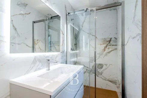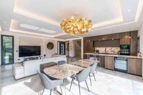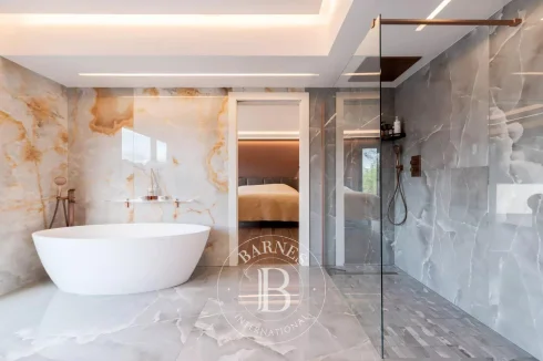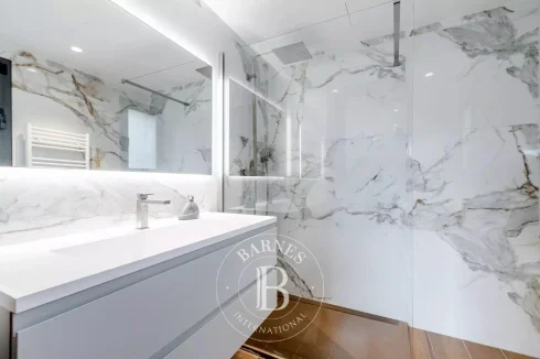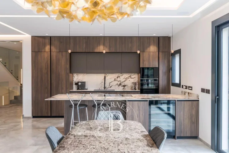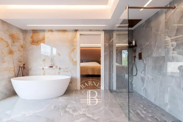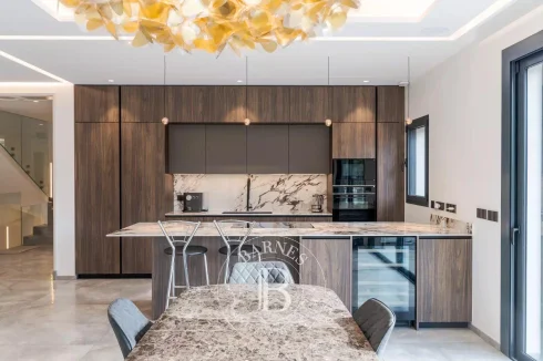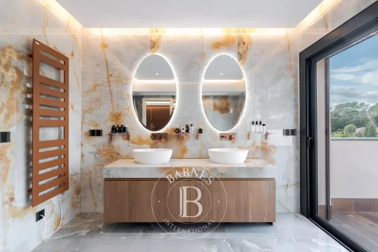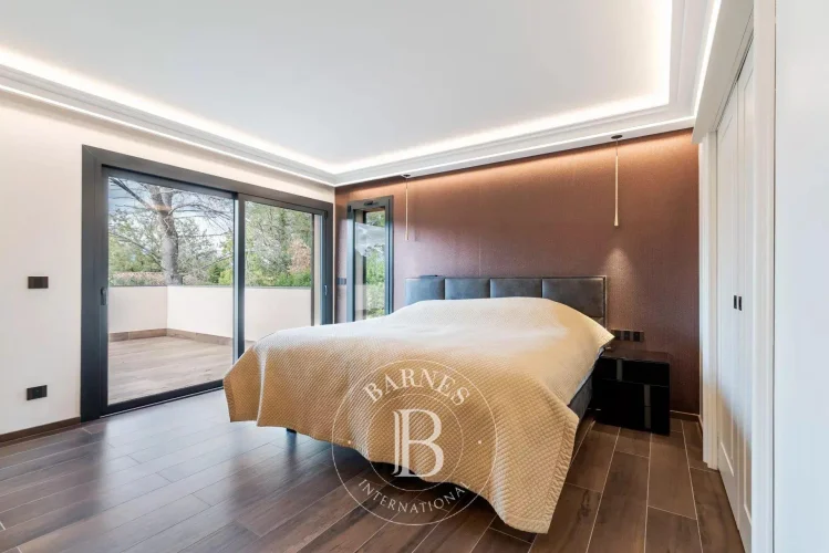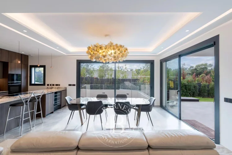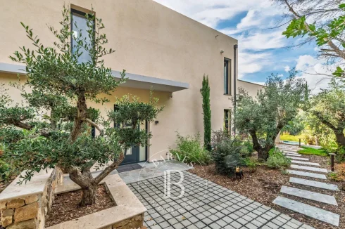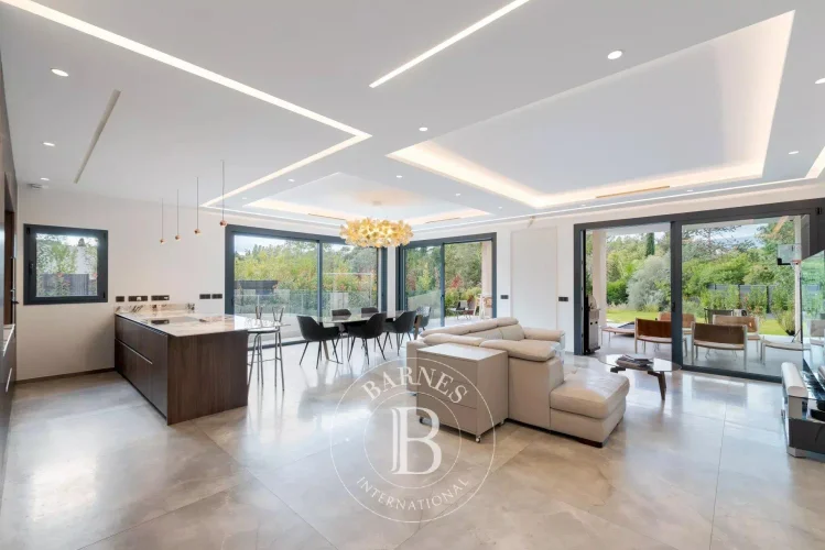 Exceptional location within walking distance of the village of Valbonne, 5 minutes from the Mougins School and the Civ for this new modern villa offering quality services with generous volumes and beautiful light. It consists on the ground floor of a beautiful reception area with American kitchen, all opening onto a large covered terrace overlooking the swimming pool and the beautiful garden planted with Mediterranean species, a bedroom and en-suite shower room, upstairs large master bedroom with dressing room, bathroom and en-suite shower opening onto a beautiful terrace with views of the hills, 2 other en-suite bedrooms, in the basement, laundry room and huge garage of 108 sq.m that can accommodate 10 cars or be converted into a cinema or games room. Very beautiful family villa in the immediate vicinity of all amenities and easy to maintain.