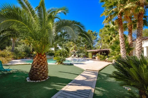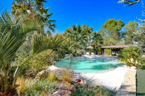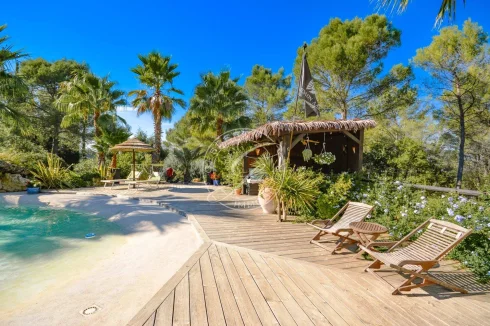 The house is entirely open to the outdoors, with large terraces, a unique fairy-tale garden, majestic palm trees, centuries-old olive trees, remarkable stonework and a fascinating lagoon pool, a true invitation to travel.