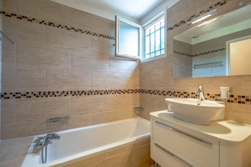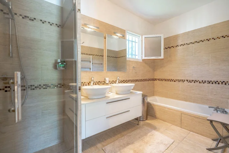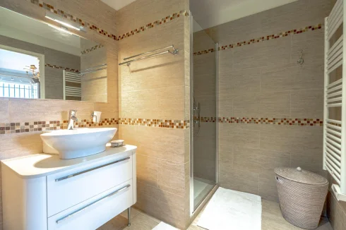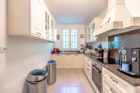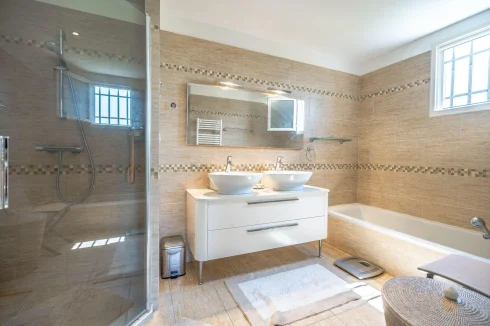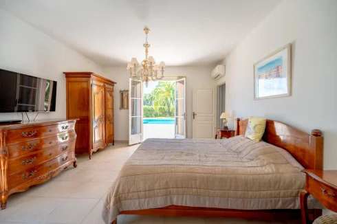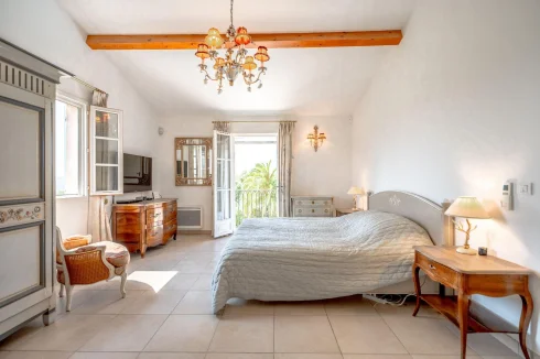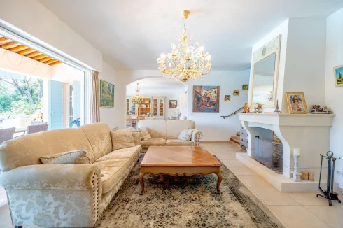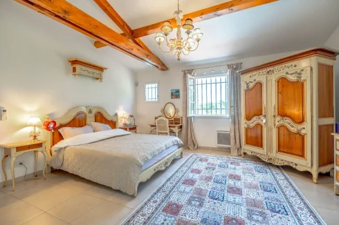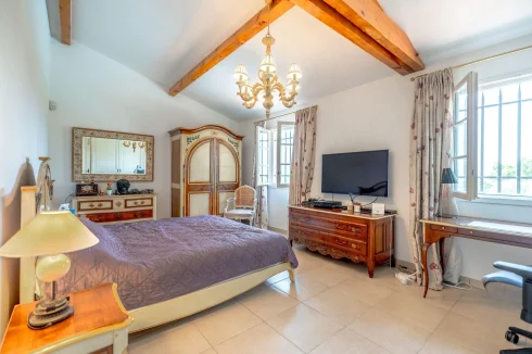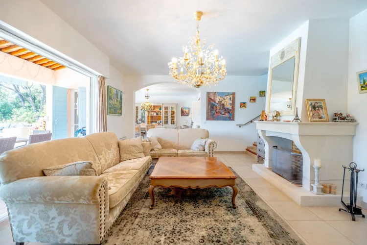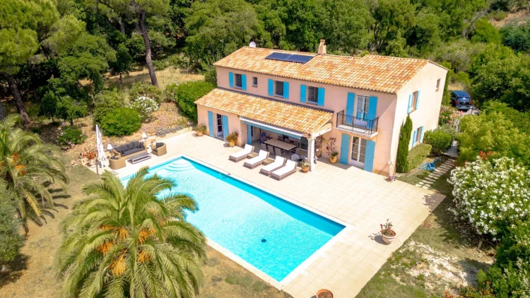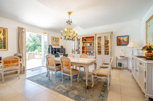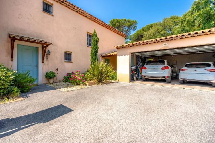 Villa for sale in Grimaud. In a quiet and green setting, approximately 5 minutes from the village of Grimaud, this superb Provençal villa of approximately 220m² is built on a beautiful plot of 2957m². The villa comprises an entrance hall, guest toilet, a large, bright living room with a fireplace opening onto a covered terrace, a dining room, a separate fitted kitchen with a pantry, and a bedroom with a bathroom, shower, and toilet. Upstairs, there are three suites with bathrooms and dressing rooms. A double garage can accommodate two vehicles and two-wheelers. A heated swimming pool adorns the beautifully landscaped garden.