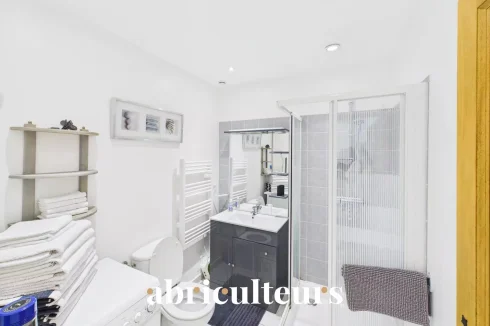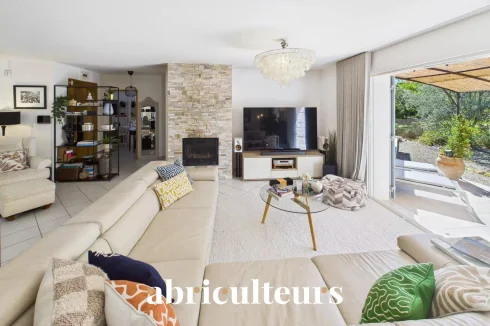 The main villa, with a surface area of 173 m², impresses from the moment you enter with its generous volumes and natural brightness. It is centered around a spacious living area filled with light, featuring an elegant stone fireplace—ideal for winter evenings. Large bay windows offer a peaceful view of the landscaped garden and provide direct access to the terrace, creating perfect harmony between indoor and outdoor living.
