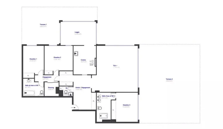 A 4-room apartment of approximately 125 m² (110.75 m² under the Carrez law) comprises a bright living room opening onto the exterior, a fully equipped separate kitchen extending into a veranda, and a sleeping area with three bedrooms, two of which are en suite with bathroom/shower, toilet, and dressing room.