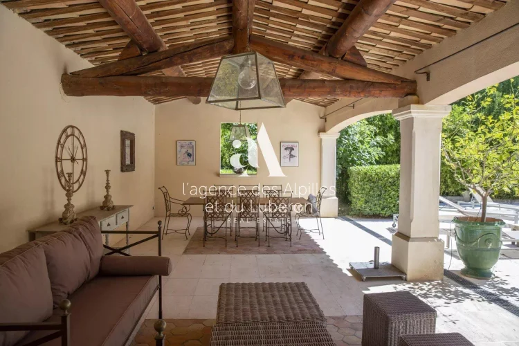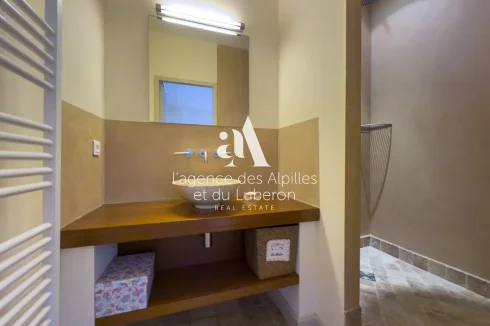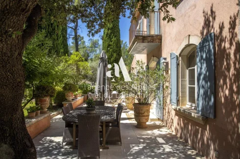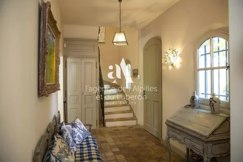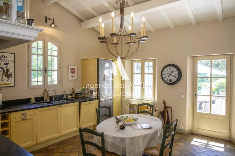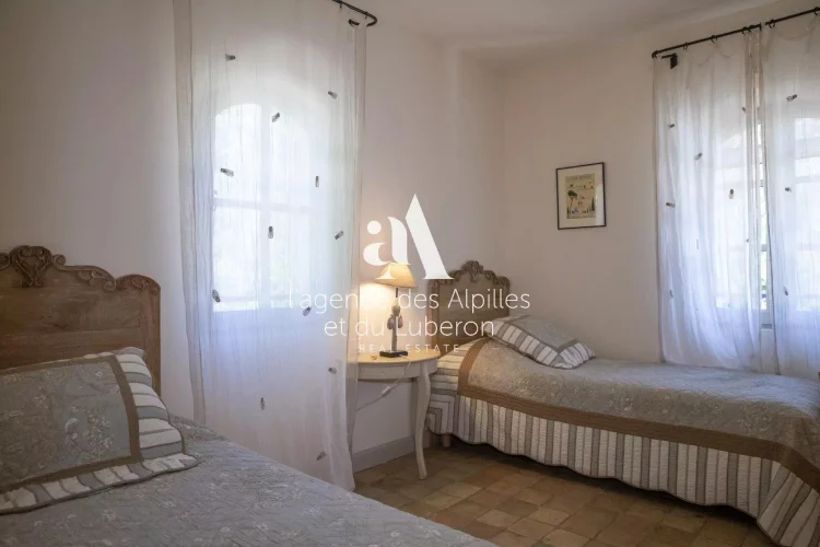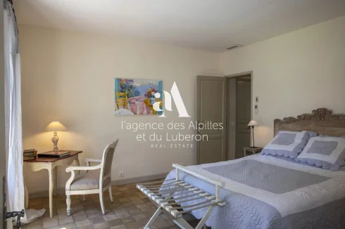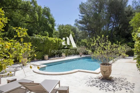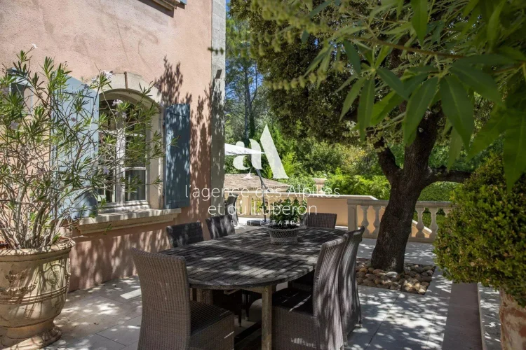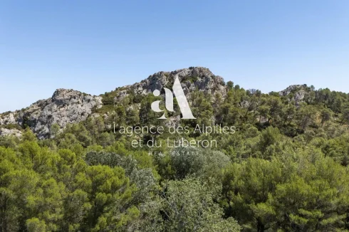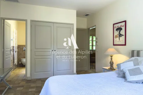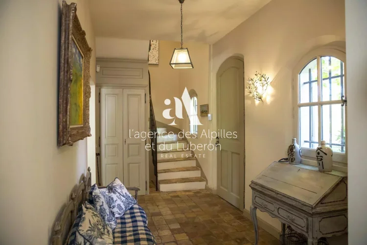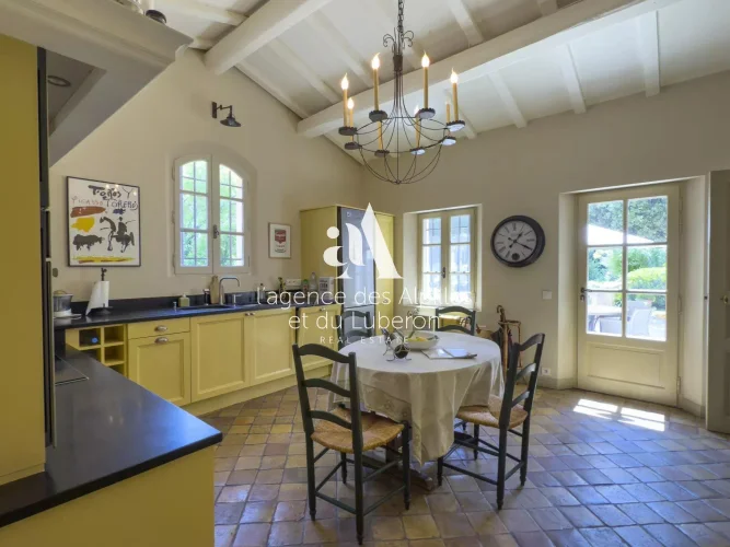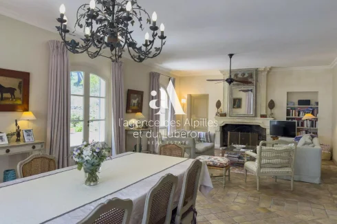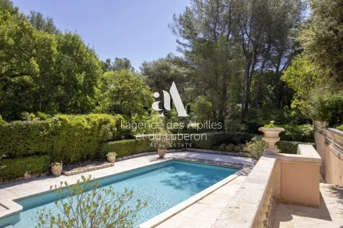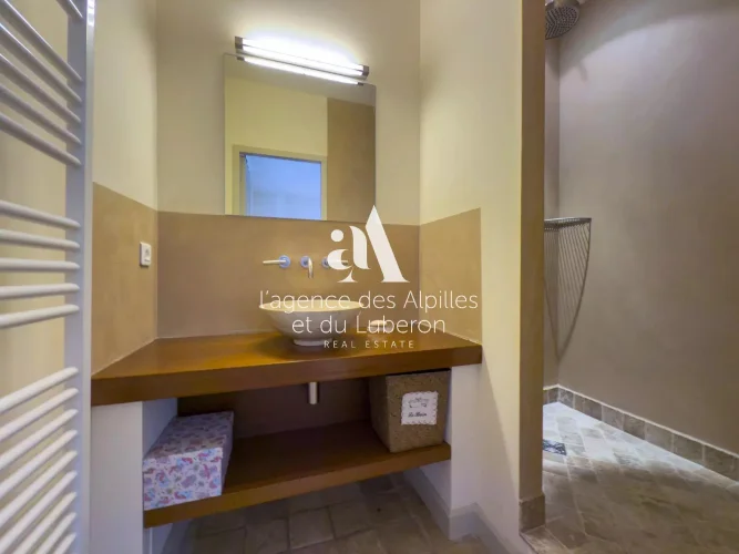 Beautiful Tuscan-style house of approximately 230 m² (2,500 sq ft) built with high-quality materials, opening onto a landscaped park nestled in the Alpilles hills. On the ground floor, we find a large 65 m² (680 sq ft) living room with a stone fireplace, a separate kitchen, and an en-suite bedroom.