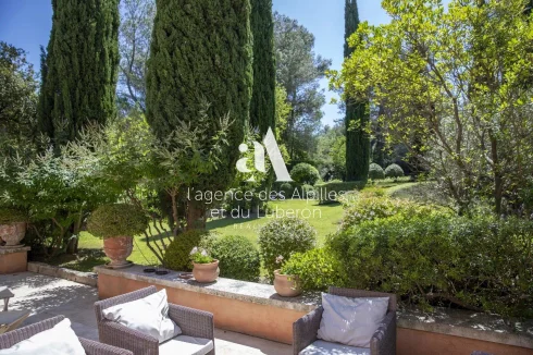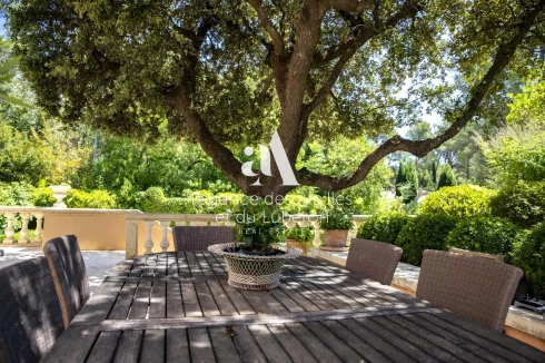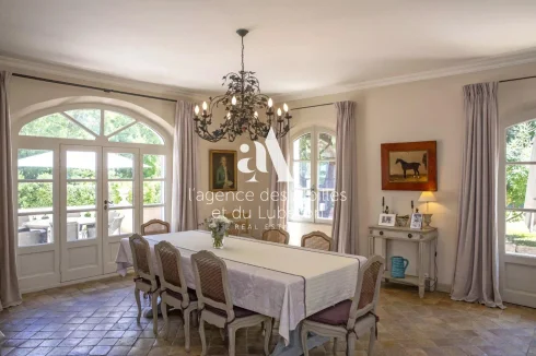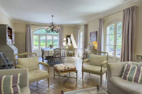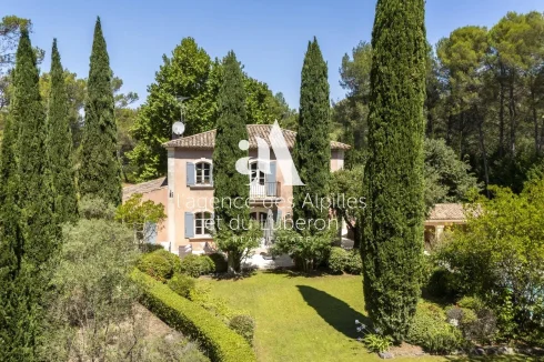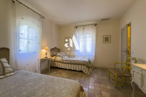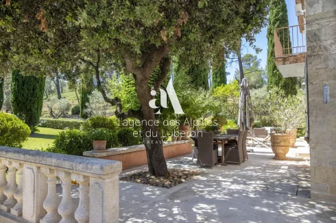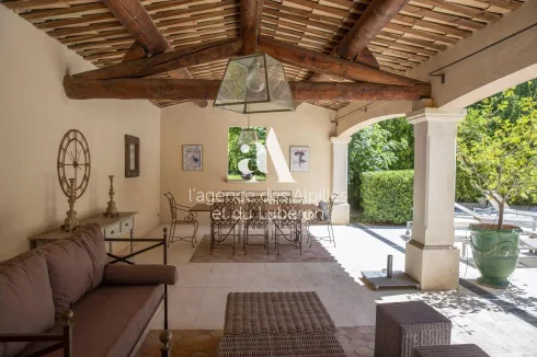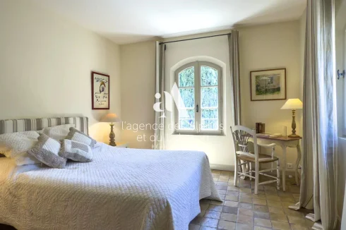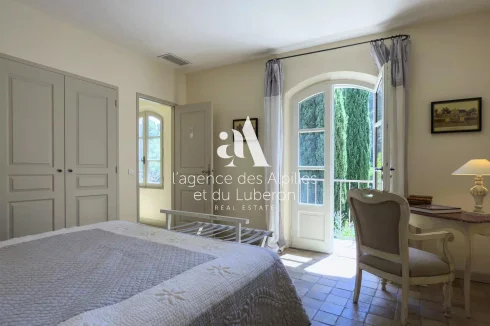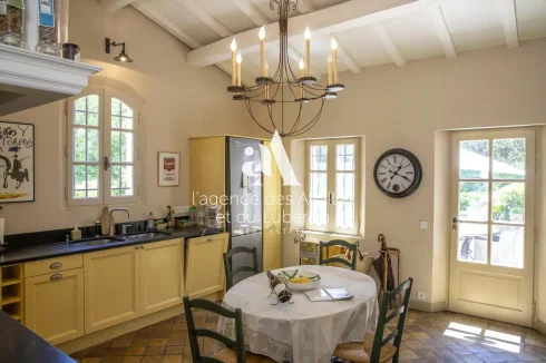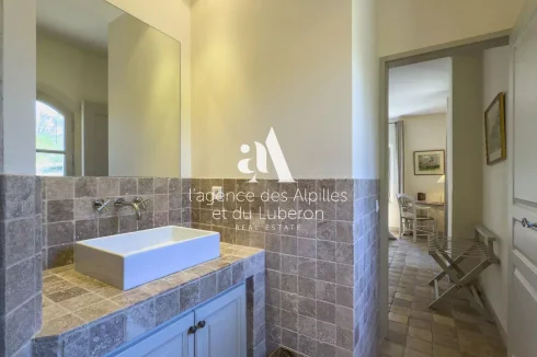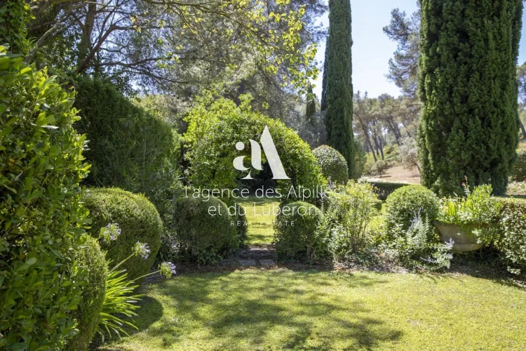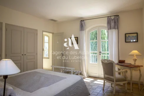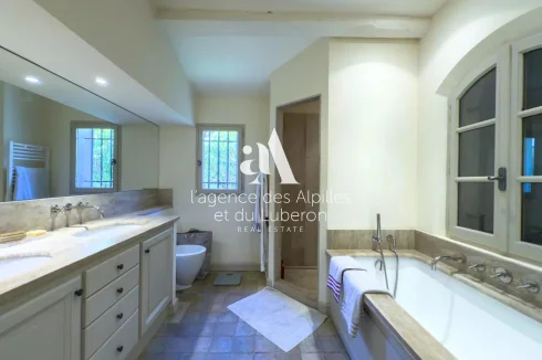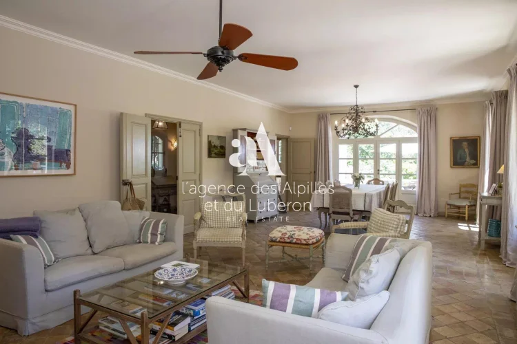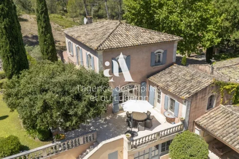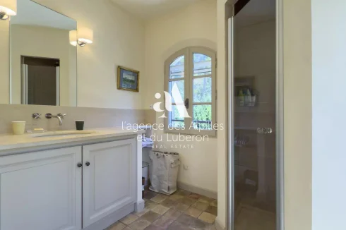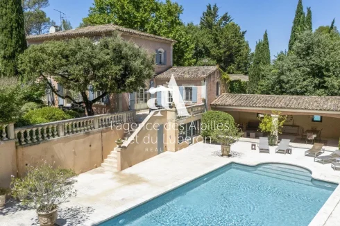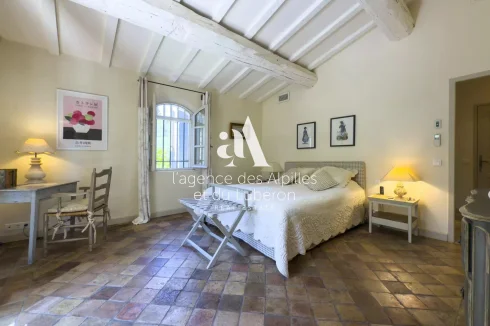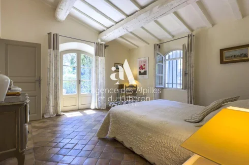 Beautiful Tuscan-style house of approximately 230 m² (2,500 sq ft) built with high-quality materials, opening onto a landscaped park nestled in the Alpilles hills. On the ground floor, we find a large 65 m² (680 sq ft) living room with a stone fireplace, a separate kitchen, and an en-suite bedroom.