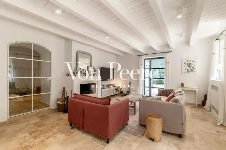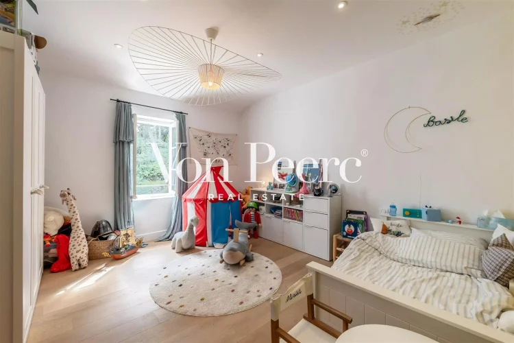 The outdoor space is a true summer haven, with a large swimming pool, a sun-soaked terrace, and a spacious pool house—perfect for relaxing outdoor moments. Additionally, a large enclosed garage provides secure storage space for vehicles.