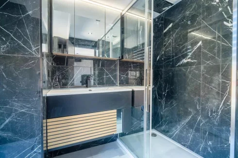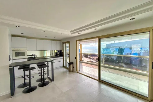 This refined residence welcomes you with a thoughtfully designed entrance hall leading into a luminous living space that flows seamlessly into a fully equipped, open-plan kitchen. The interiors have been tastefully appointed, blending contemporary elegance with comfort, while expansive sliding windows open onto a generous 12 square metre terrace—perfect for enjoying the captivating sea views and the ever-changing Riviera light.