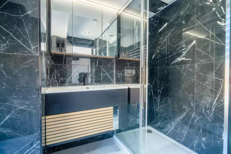 The bedroom offers a tranquil retreat, complete with an en-suite shower room and toilet, while a separate guest toilet ensures both convenience and privacy for residents and visitors alike. Every detail has been curated to enhance the living experience, with modern finishes that include air-conditioning, double glazing, electric shutters, sliding windows, electric awnings, and a window shade system to create an atmosphere of relaxed sophistication.