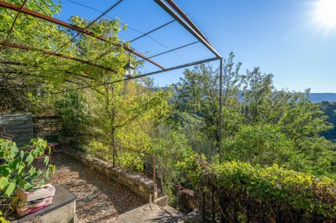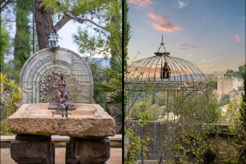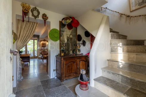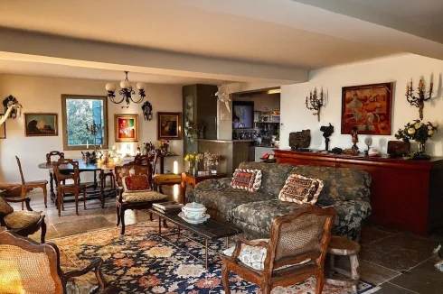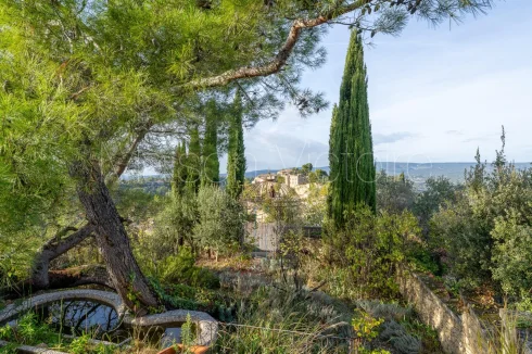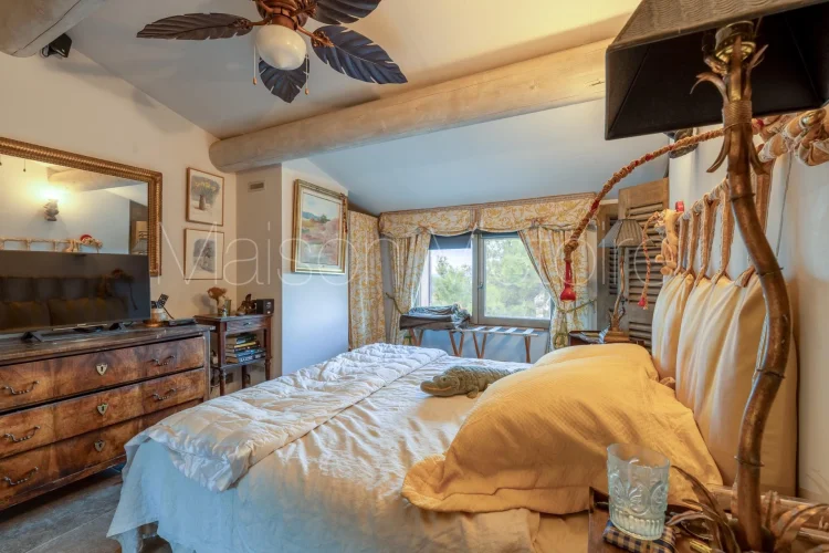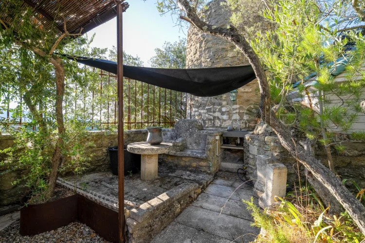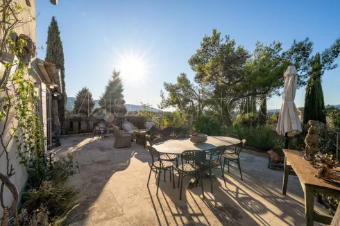 The carefully landscaped 0.15-acre garden, planted with a variety of Mediterranean trees and flowering plants, is threaded with a winding path that leads past a wrought-iron pavilion. A spacious terrace runs along the façade of the house, offering the perfect spot for outdoor dining and entertaining with breathtaking views of the village below. The swimming pool is framed by a large sunbathing terrace.