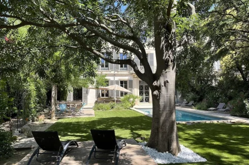 The garden is subtly landscaped with a heated swimming pool and a shaded terrace.
