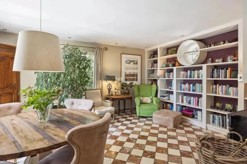 The main house welcomes you with a spacious entrance hall that opens into a bright living room, enhanced by a cathedral ceiling and a stone fireplace, perfect for cosy evenings and gatherings. Flowing naturally from the living area, the dining room connects to a fully fitted open-plan kitchen with a central island, creating the ideal space for cooking and sharing meals with family and friends. A library, which can be used as a reading room or study, adds an extra touch of warmth and quiet retreat.