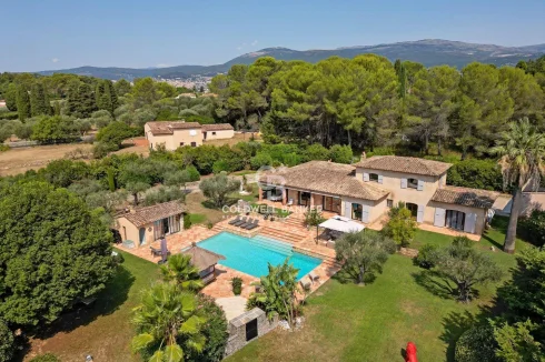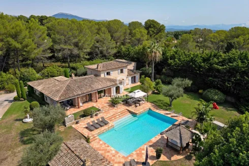 Just five minutes from the charming village of Valbonne and twenty-five minutes from Nice Airport, this expansive family home lies at the heart of a beautifully landscaped park, enhanced by a mature olive grove and offering open views over the surrounding hills. Upon arrival, a driveway winding through the orchard leads to the main entrance, where ample parking and a triple garage make welcoming guests effortless. On the ground floor, the house features an entrance hall with built-in storage, a bright double living room with dining area, an independent kitchen with adjoining laundry room, and a principal suite complete with study, walk-in wardrobe, shower room, and separate toilet, as well as a guest Wc. These living spaces open onto a south-facing terrace and garden, while large pocket sliding windows flood the interior with natural light. A partially covered section of the terrace offers welcome shade during the hottest days. Also on this level are two additional bedrooms, each with its own shower room, along with a spacious self-contained studio. Upstairs, two further bedrooms — one with a rooftop terrace — share a bathroom and separate toilet. Outdoors, the property offers high-quality amenities: a heated swimming pool measuring 16 x 7 m, a relaxation area with jacuzzi and waterfall, an air-conditioned pool house with wood-fired oven, a garden pergola, a wooden thatched hut, a pétanque court, a storage shed, and a technical room. Additional features include a private well, automatic irrigation, solar panels, and motorised gates. A ventilated crawl space and a generous basement ensure the home’s durability and comfort. A rare opportunity where comfort, space, and a natural setting come together in perfect harmony. Agency fees are payable by the seller. Information on the risks to which this property is exposed is available on the Géorisques website: