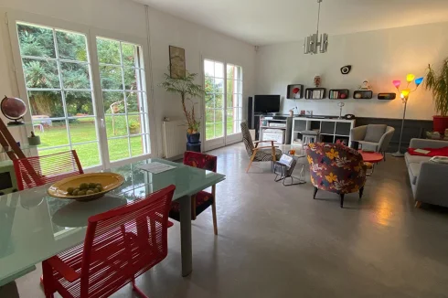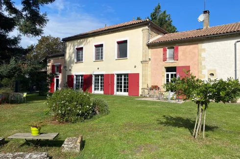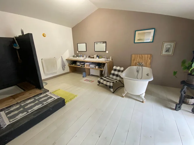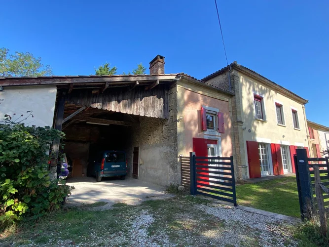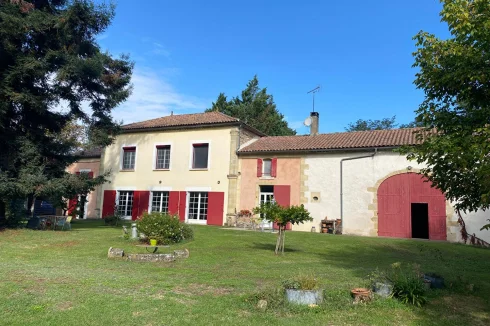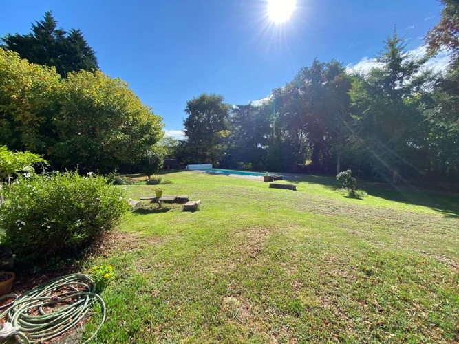 Set at the end of a long private driveway, this charming farmhouse welcomes you into a tranquil setting surrounded by woodland and garden. The main house, tastefully renovated in a style that blends contemporary with classic charm, boasts spacious rooms and abundant natural light. You'll find a large living area overlooking the garden, featuring a fully equipped kitchen and a stunning stone fireplace. A second generous room?currently used as a music room?a bedroom, and a bathroom complete the ground floor. Upstairs, three additional bedrooms and a large bathroom provide all the comfort needed for family living or hosting guests. Attached to the main house is an independent studio with a mezzanine, ideal for accommodating visitors or developing a rental project. A large 110 m² barn completes the property, offering plenty of scope for your imagination?whether for guest rooms, gîtes, a workshop, or more. Nestled within its own grounds, the swimming pool invites you to relax in a peaceful and bucolic setting, all just a few minutes from local amenities. (4.61 % fees incl. Vat at the buyer's expense.)