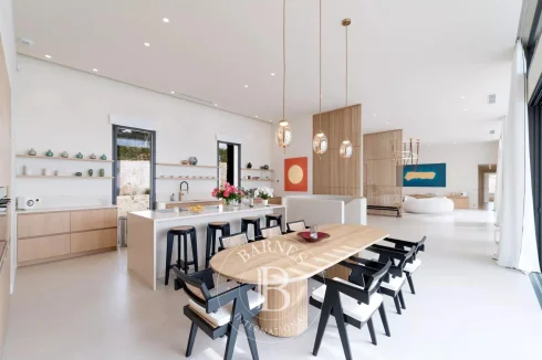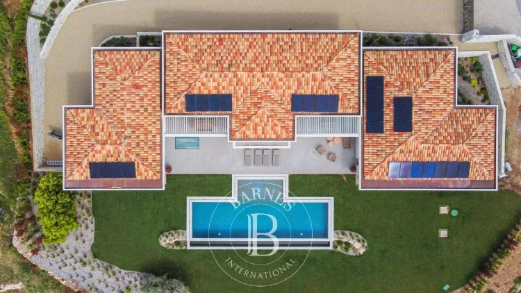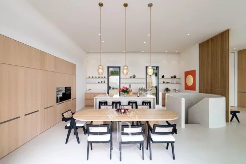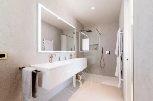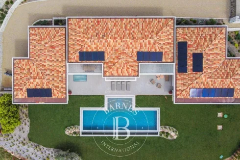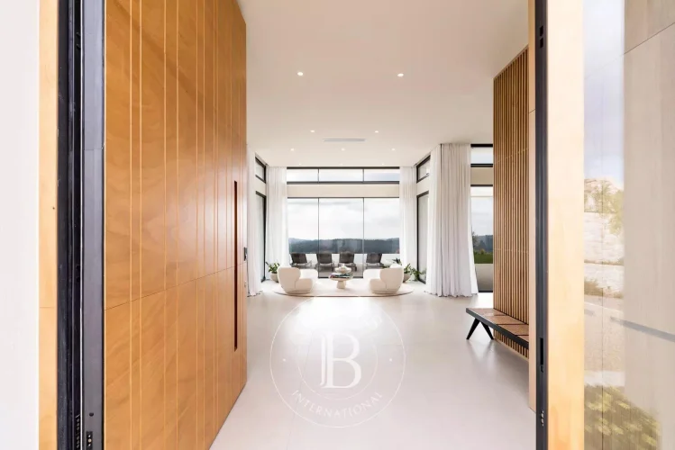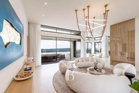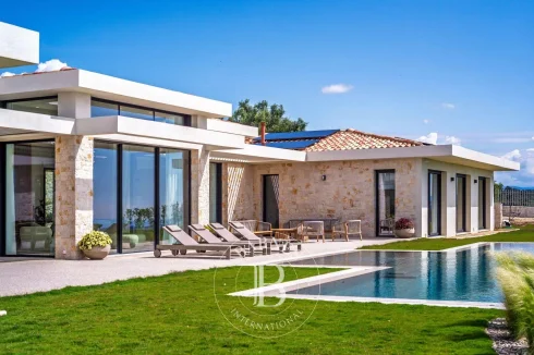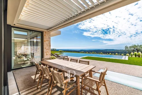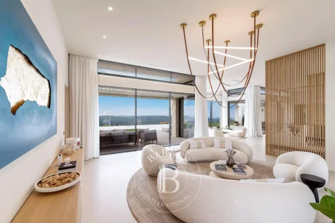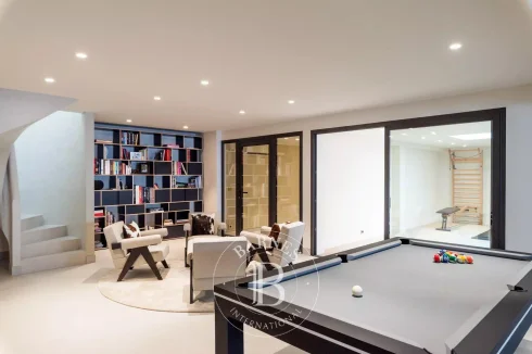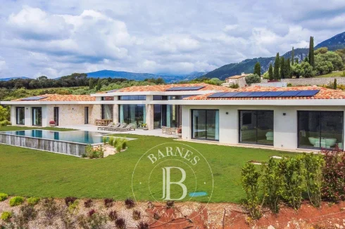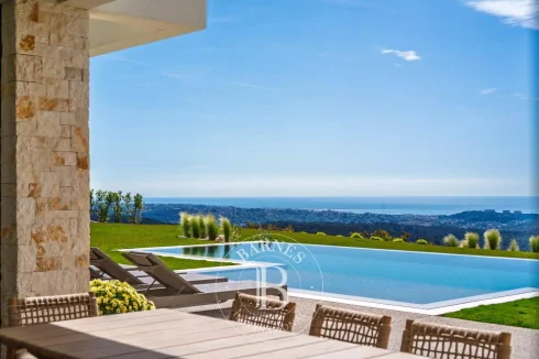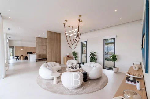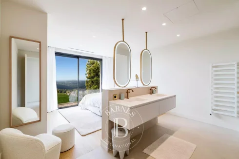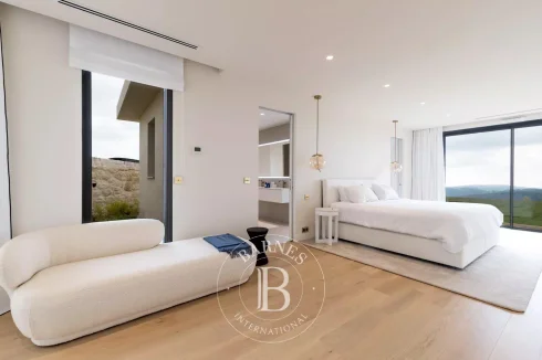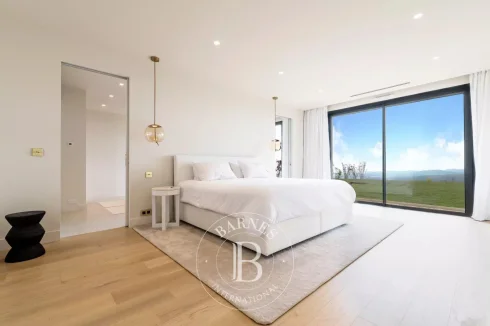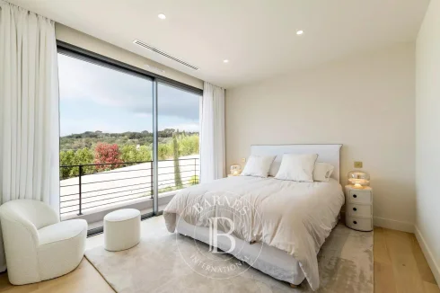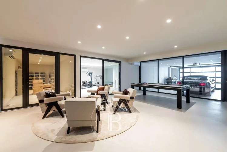 Exceptional location in absolute calm sheltered from views in a dominant position, in the heart of a sought-after residential area, new contemporary villa totaling approximately 575 sq.m benefiting from breathtaking views of the sea and the surrounding hills built on a plot of 3,605 sq.m. It consists of a large and bright reception area, open kitchen with pantry, a spacious master bedroom with dressing room and en-suite bathroom, 5 other en-suite bedrooms with dressing room including one converted into a cinema. A basement with games room, gym, shower and toilet, wine cellar, storage room, technical room and on the garden level, an independent 2-room apartment with living room/kitchenette, bedroom and shower room. Large garage and several parking spaces. Unique property on the market.