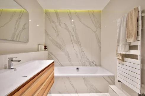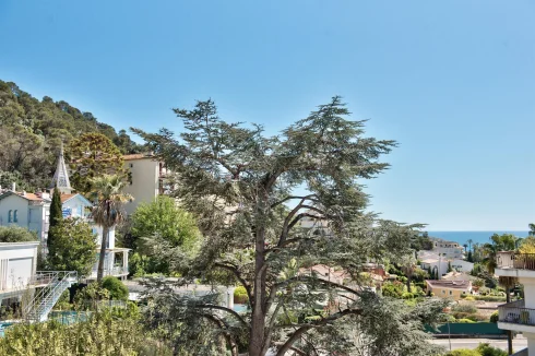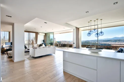 Nice Mont Boron - Located in a luxury residence, large 2 bedroom apartment of 108 sqm in perfect condition, fully renovated, with terrace and panoramic view of the town and sea. It consists of an entrance hall leading to a large, bright living room with fitted and equipped kitchen opening onto a terrace offering superb views of the town and sea. The sleeping area consists of two bedrooms, one of which has a private shower room, a bathroom with toilet, a separate toilet and a utility room. The flat has a through aspect and enjoys plenty of sunlight thanks to its large windows and its southern and western exposure. The flat has been tastefully renovated to a very high standard, with air conditioning, parquet flooring and custom-made furniture. A garage and two cellars complete this property. An outside car park can also be sold in addition to the sale price.