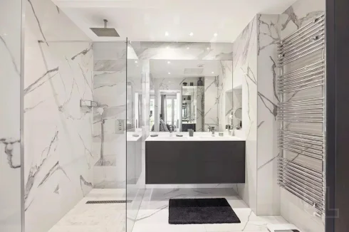 Situated in a sought-after residence with a caretaker, just a few steps from the Croisette, the beaches and the shops, this prestigious four-room apartment in Cannes Banane has been fully renovated to a high standard and offers 110 square metres of elegant, comfortable living space as measured by the Carrez law. The bright double living and dining room opens onto a spacious terrace, providing an ideal setting for relaxing or entertaining, while the open yet separate kitchen combines practicality with refined design.