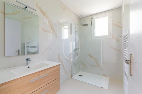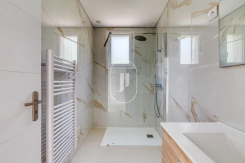 Generous in size, the villa offers five en-suite bedrooms, including one on the ground floor – ideal for welcoming family and guests in optimum comfort. The living area, bathed in natural light through large openings, comprises a spacious lounge with open-plan kitchen of 40 m² (kitchen to be fitted to your taste), seamlessly extending the interior towards the outdoors.
