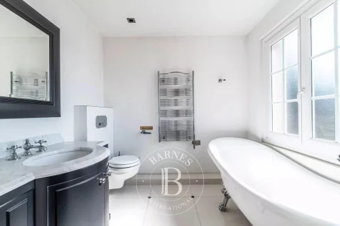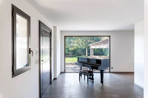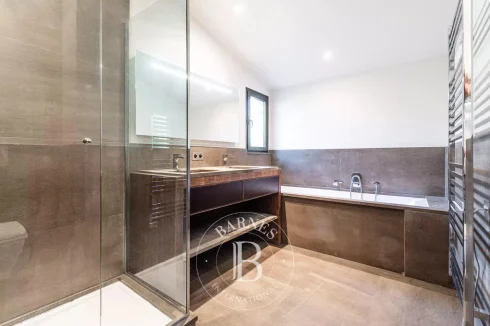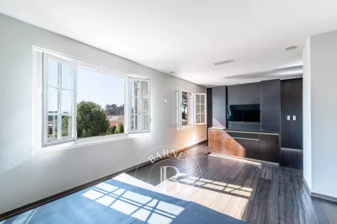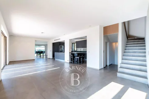 Bathed in light, it comprises a vast living room with double-sided fireplace, a dining room and a bespoke open-plan kitchen fitted with Gaggenau appliances and an integrated wine cellar. The living areas open onto a terrace, landscaped garden and swimming pool thanks to large sliding glass doors.