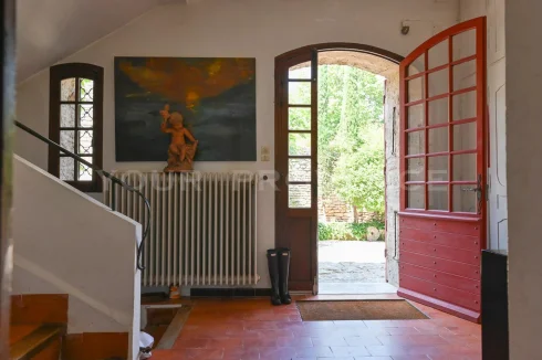 The house offers approximately 205 m² of living space on two levels. On the garden level, there is an entrance hall with a cloakroom, toilet, and shower room, followed by the large living room (30 m²) with a Provençal fireplace and French-style ceilings. Continuing onto the living room is a second living room (28m²), followed by a library (11m²). Adjoining the living room, the kitchen (15m²) offers direct access to the garden and a terrace under a pergola to enjoy the view.