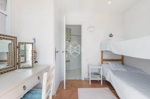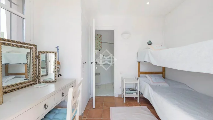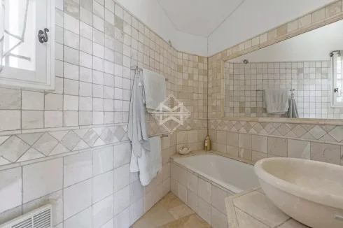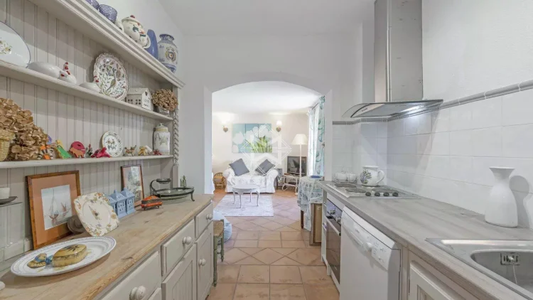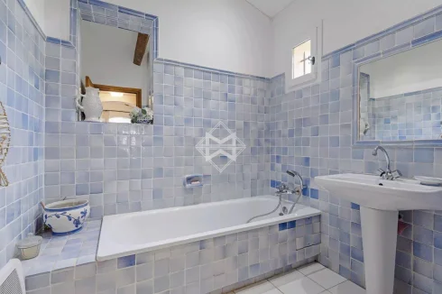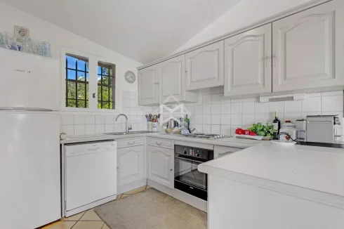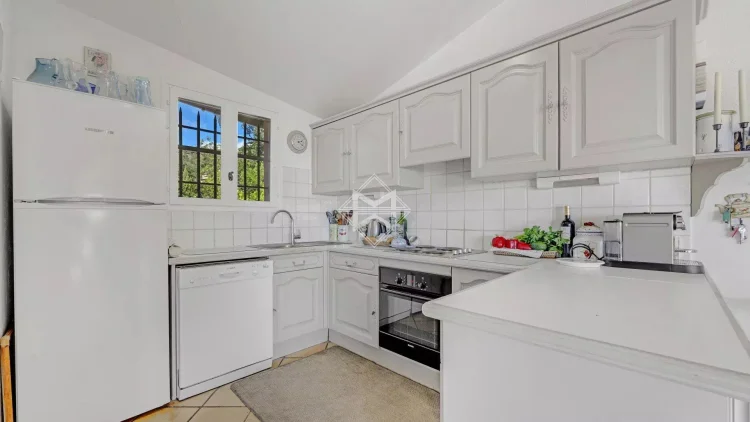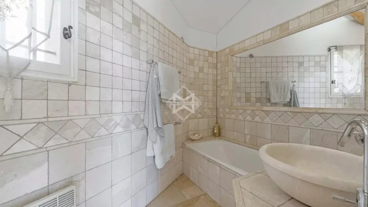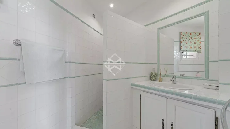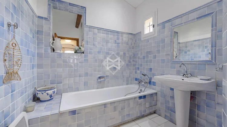 The 2300sqm plot ensures complete privacy and includes a pétanque court, meticulously maintained Mediterranean plants, an 8x4 m swimming pool, double garage and multiple parking spaces, electric gate with intercom, automatic irrigation system, outdoor lighting, and mains drainage.