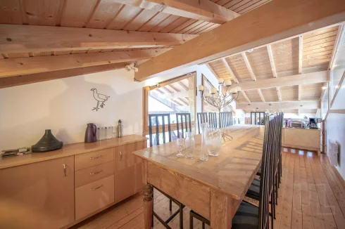 The main living area is bright and inviting, featuring a fireplace and large windows that frame stunning views of the surrounding forest and mountains. These open out onto a sunny south-west facing balcony, perfect for soaking up the alpine atmosphere. A mezzanine above the lounge and kitchen serves as a dining area, creating a warm and welcoming space for family and friends to gather.