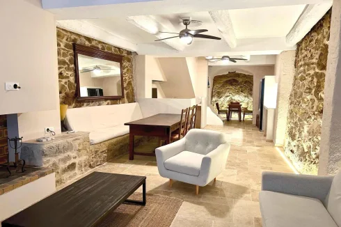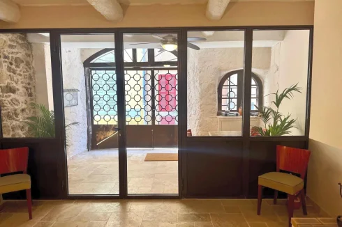 In the heart of the historic village of Grimaud, house of 75 m2 on 2 levels for sale in the agency Carine Thoniel Immobilier. It has recently been completely renovated. It comprises an entrance hall, a large living room with stone walls, open-plan kitchen and fireplace, a cellar and, upstairs, 2 bedrooms, each with dressing room and shower room plus separate toilet.