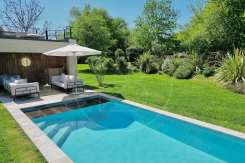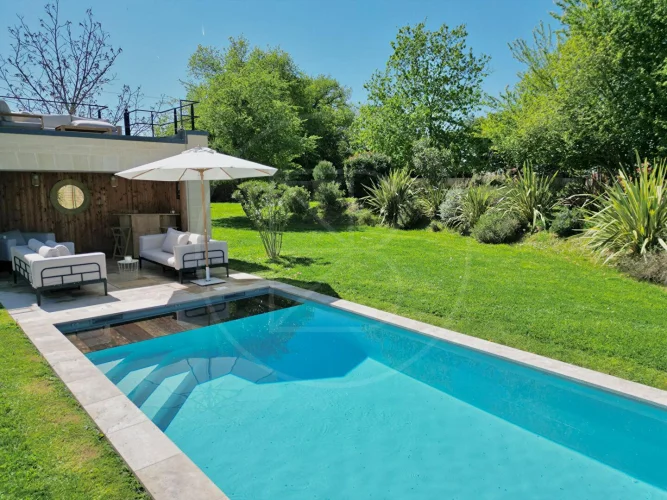 Situated in the Fronsadais, close to the small shops of a pretty, dynamic village, less than 15 minutes from Libourne with its Tgv train station and 35 minutes from Bordeaux, this traditional residence with its white Brétignac stone facade boasts unexpected top-of-the-range features. Completely renovated, the house will surprise you with the quality of the meticulous work. The interior layout offers impeccable acoustic and energy performance and absolute comfort. The ground floor comprises a vast living area with cleverly delineated areas: lounge, dining room and open-plan kitchen. Thanks to the many windows, the light streaming through plays on the finely-chosen tones of the walls, creating a soothing harmony. Upstairs are three beautiful bedrooms, including a magnificent master suite. The exterior of the house benefits from the same attention to detail: two terraces to the east and west, a fully planted and soon to be lush landscaped garden, complete with a large heated swimming pool. Finally, the rooftop pool house offers spectacular views of the house and surrounding landscape. We would like to emphasise the rarity of this exceptional property, which requires no work whatsoever. Make an appointment now!