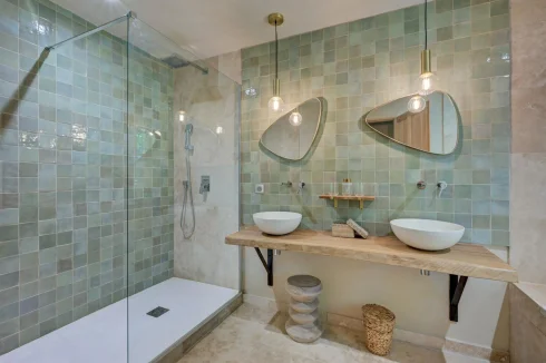 On the ground floor, you enter in a spacious entrance hall, leading to a living room with a fireplace, a dining room, an office with numerous French doors opening onto the terraces, a TV/cinema room, a toilet, a fully equipped kitchen with a central island and a seating area, a pantry, and a laundry room.
