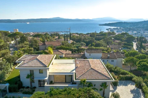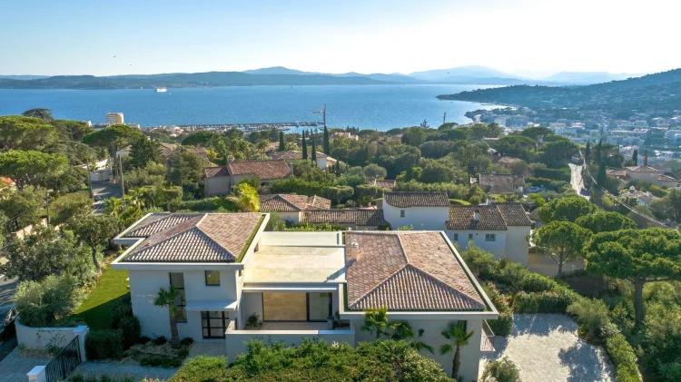 Sainte-Maxime villa for sale. Exclusive! In the popular Semaphore district, this magnificent villa benefits from a superb panoramic sea view and luxurious services. Reception hall with guest cloakroom, a large living room opening onto a terrace and patio, but also 5 beautiful suites with bathrooms and dressing rooms are among the assets of this sublime property. It also includes a hammam, a gym, a wine cellar and a large garage. A beautiful swimming pool in the heart of a green garden completes the equipment of this exceptional villa. Reduced fees.