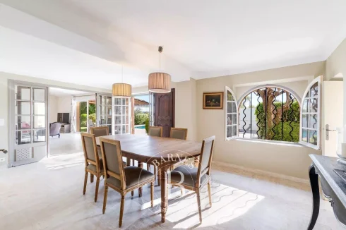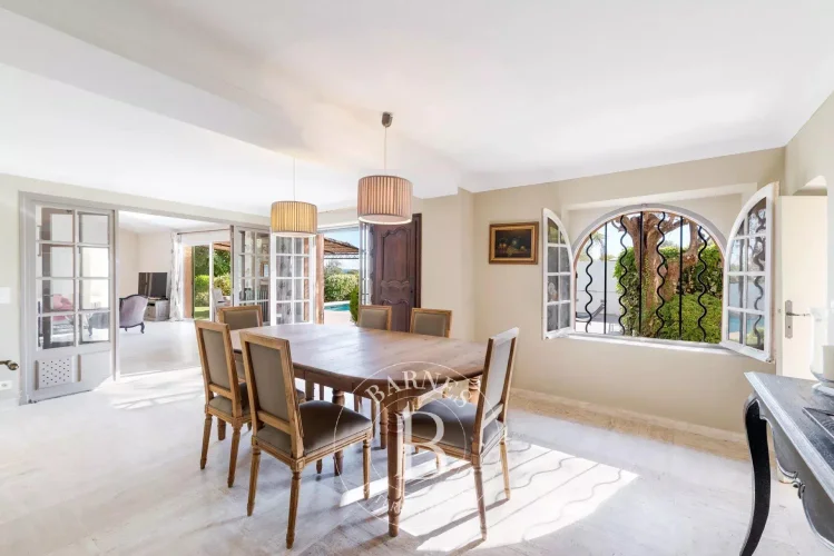 Inside, the villa boasts a vast, light-filled cathedral-style living room with a fireplace and direct access to an outdoor terrace. A convivial dining room, a fully equipped kitchen with adjoining pantry and laundry room complete the living spaces, all opening onto the pool and garden area.