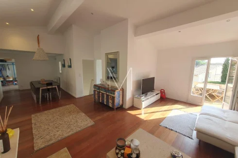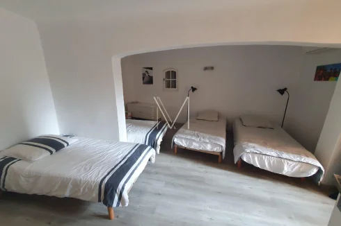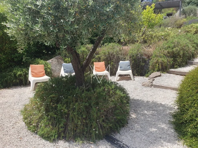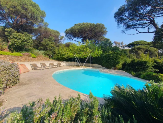 Holiday home located in Gassin, in a pretty estate, of approximately 140m2 on 2 levels, partly composed on the ground floor of a very beautiful living room full height with pretty fireplace, open fitted kitchen, dining room, direct access to the terrace and the swimming pool, 1 small bedroom with shower and toilet, 1 small balcony type tropezian terrace, 1 entrance hall with storage. On the lower floor, ground floor level, 2 bedrooms including 1 large dormitory type bedroom, 1 bathroom with shower, double sink, 1 separate toilet, 1 master bedroom with dressing room, shower room and toilet, 1 laundry room with direct access to the garage. 2 private parking spaces, newly redone roof, very beautiful garden area planted with flowered and tree-lined terraces, free-form swimming pool with tiled decks, large terrace running along the entire south side of the house with shaded pergola, mains water and sewer. Largely renovated in 2020 (plumbing, electricity, roof, door and window frames, etc.)!