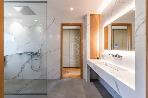 The upper floor, served by a staircase and elevator, offers a hallway with an office space, three en-suite bedrooms, including a magnificent master, each bedroom having a terrace.