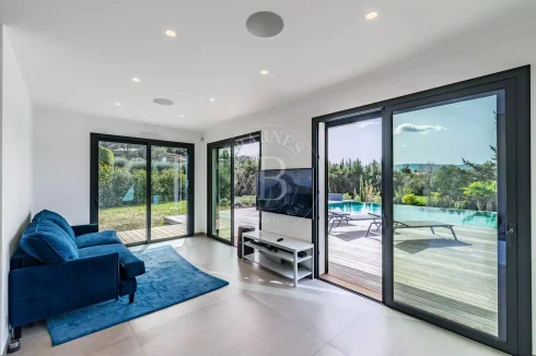 On a flat plot of 2 800 s.qm, the villa has a 14-metre mirror swimming pool, an equipped summer dining room (barbecue, plancha and pizza oven) under a covered terrace and a beautiful outdoor lounge.