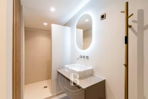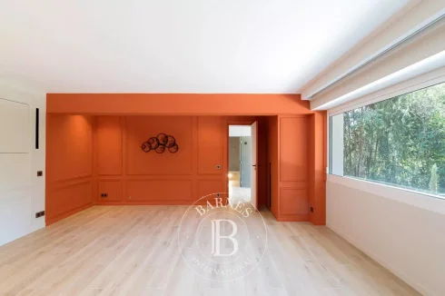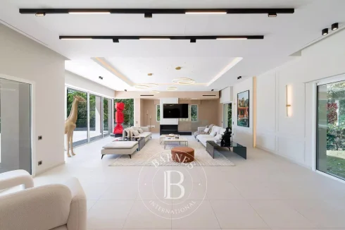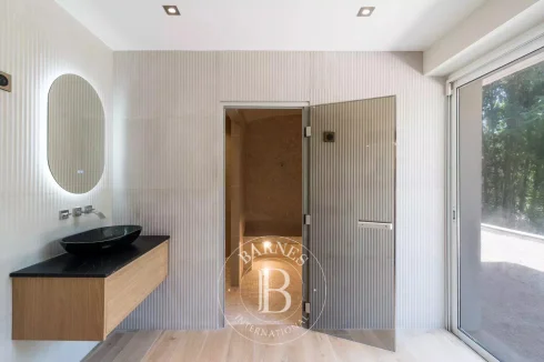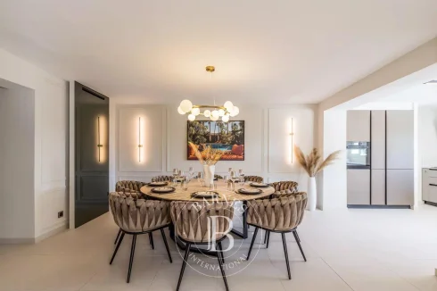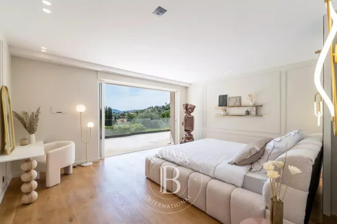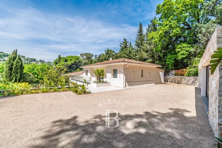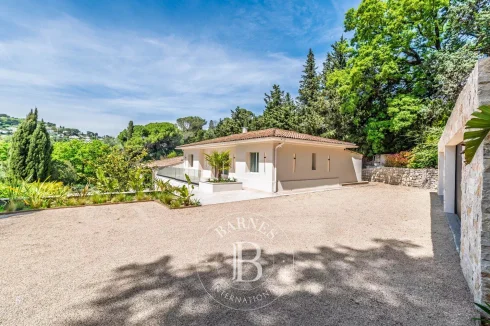 Exceptional location, in peace and quiet, walking distance from all amenities of Val de Mougins, for this magnificent renovated villa with refined decoration enjoying a panoramic view of the surrounding hills. It is composed on 3 levels, of a beautiful entrance, vast and very bright reception area with living room and fireplace, dining room, equipped kitchen and laundry room/pantry, 5 en suite bedrooms including a master, one being converted into a cinema, an office and a hammam. Landscaped garden with a large relaxation area around the swimming pool, pétanque court, and garage of 90sq.m, several parking spaces. Ideal for a family.
