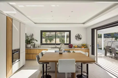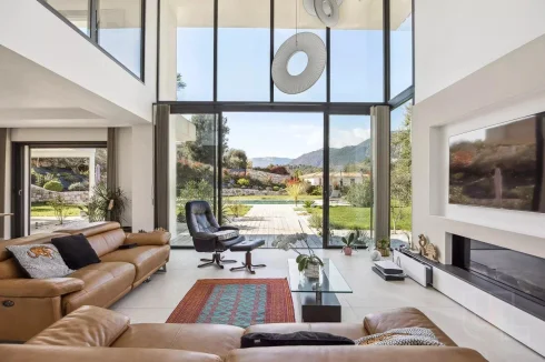 The villa is defined by its clean architectural lines, high-end finishes, and thoughtful layout, with every room bathed in natural light. Outside, expansive terraces surround a stunning swimming pool, offering ample space to soak up the sun or dine under the stars, all while enjoying the serene mountain views.