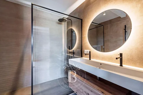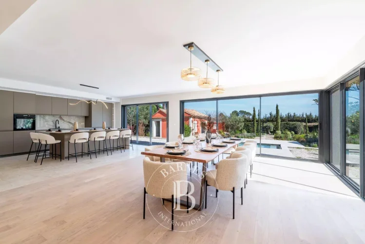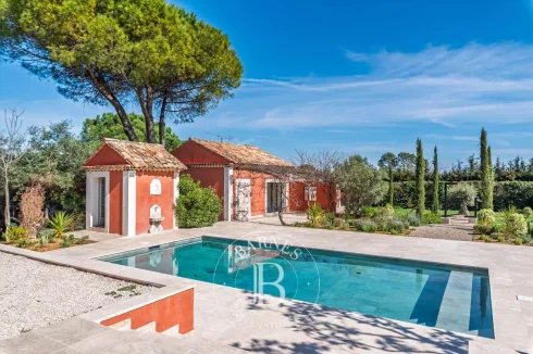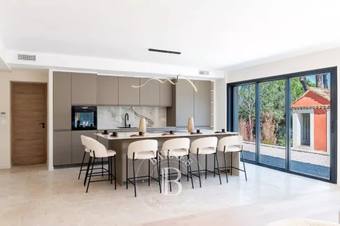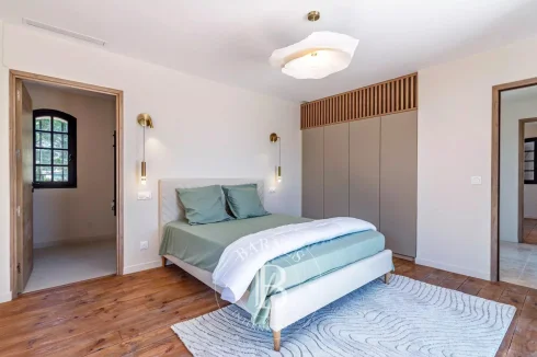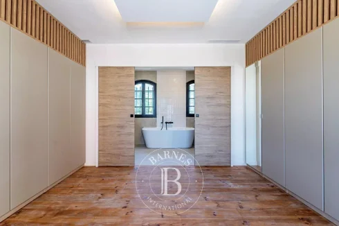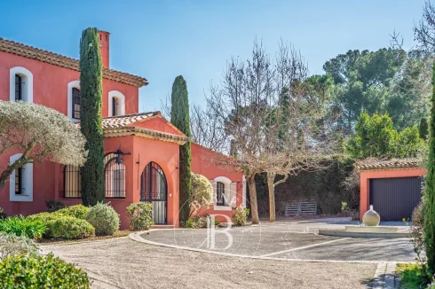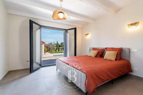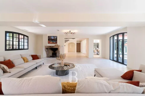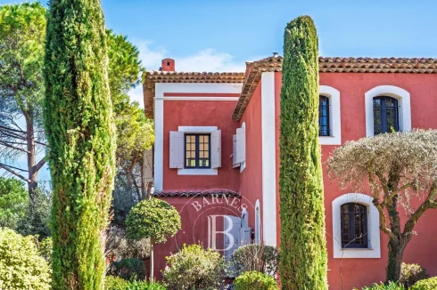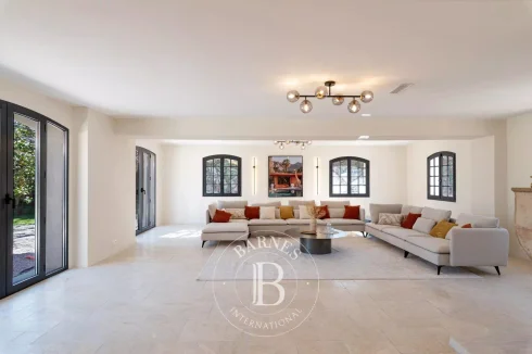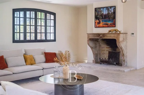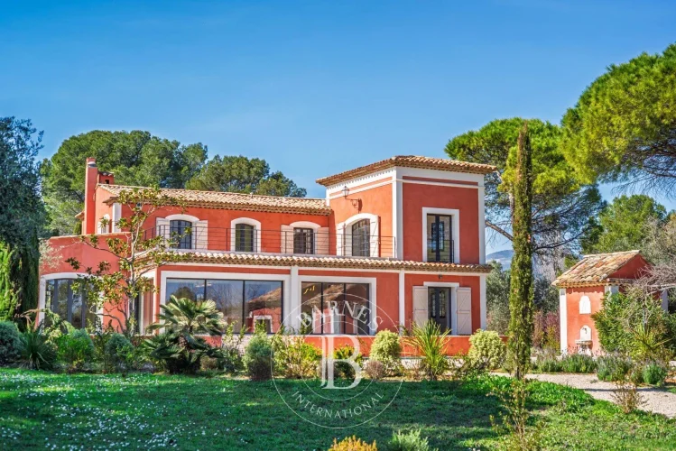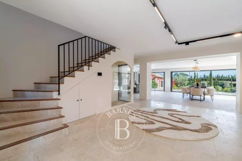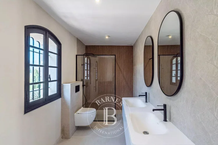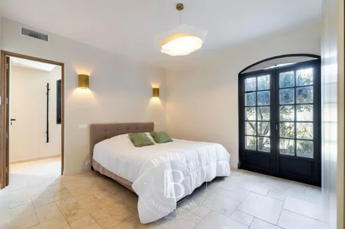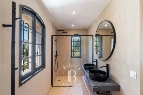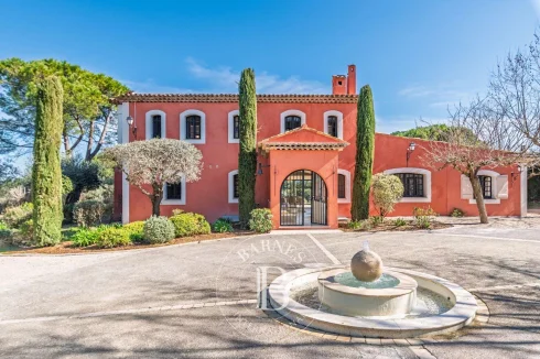 Magnificent driveway leading to the master house, which consists on the ground floor, of an entrance, large reception area very bright with beautiful openings onto the flat landscaped park of 5 545 sq.m, living room with fireplace, fully equipped American kitchen with dining room opening onto the terrace and swimming pool, 2 en-suite bedrooms, wine cellar, upstairs, master bedroom with dressing room and en-suite bathroom, another en-suite bedroom, both opening onto a large terrace enjoying views of the hills and a glimpse of the sea, in the basement, cinema/games room with kitchenette, large laundry room, storage room and technical room.