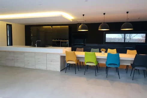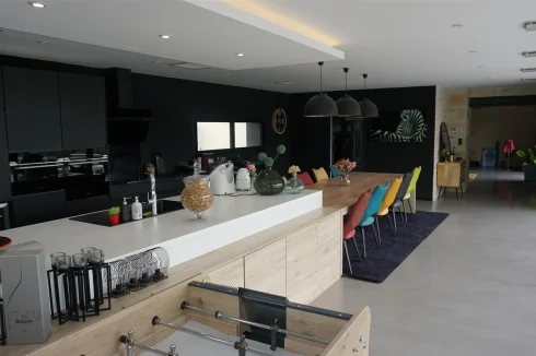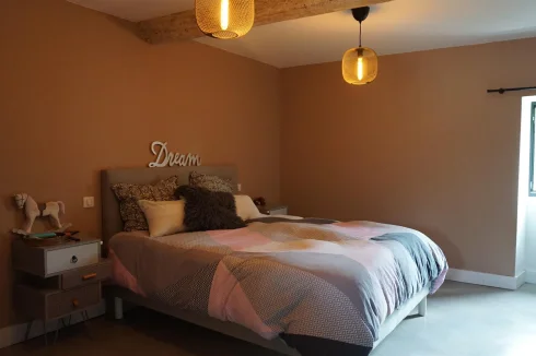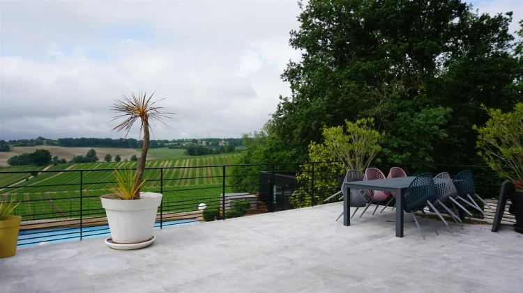 On the ground floor, entrance by a stone staircase under boletus into a 50 m² living room, with waxed concrete floor. The living room is extended by a 65 m² fitted and furnished kitchen/dining room, with pantry. Direct access through a large 8-meter bay window, to a south-facing terrace, with a view of the garden and the swimming pool. A master suite of 33 m², all comfort, with bedroom, bathroom (shower, bath, separate toilet) and dressing room