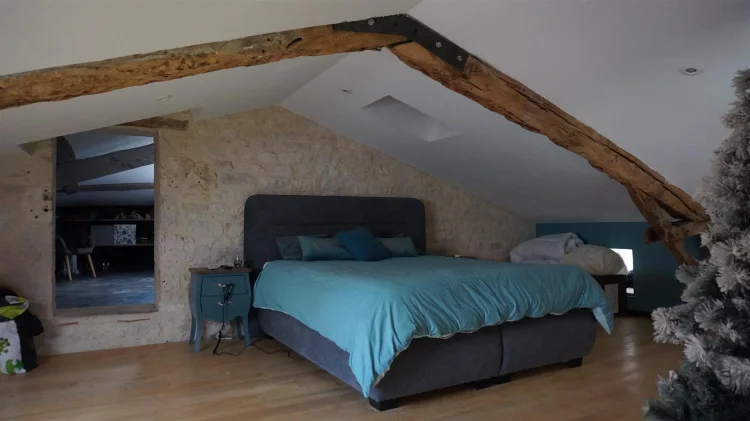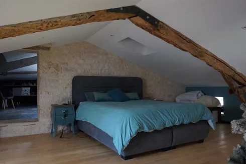 We go upstairs by a beautiful metal staircase, this mezzanine under the rampant offers a bedroom with shower room and dressing room (58m²).