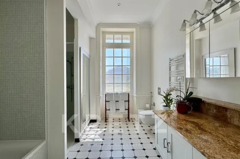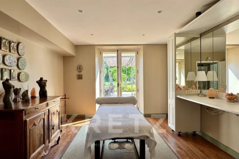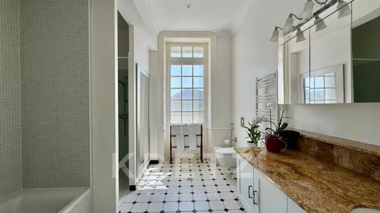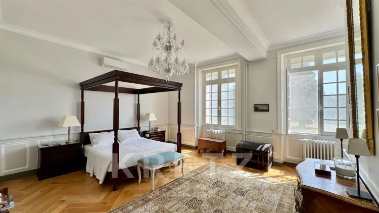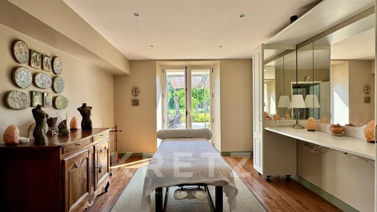 On the ground floor in the main building: spacious entrance gallery, 2 living rooms, dining room, kitchen. In the wings: kitchen with living room, laundry room, 2 offices, cinema room, gym, massage parlor, shower room, hammam. Garage of 180m2 (possible reception room (29mx6.3m) with cellar underneath.
