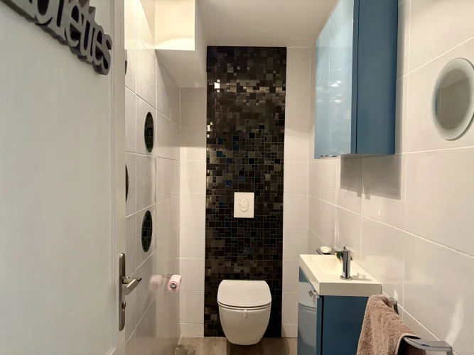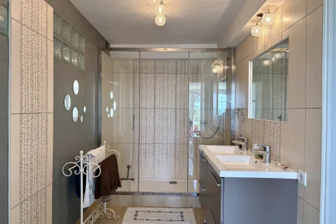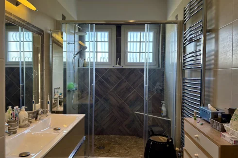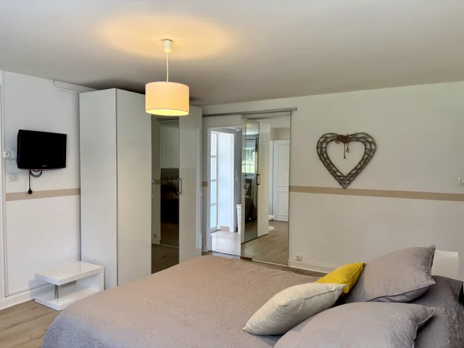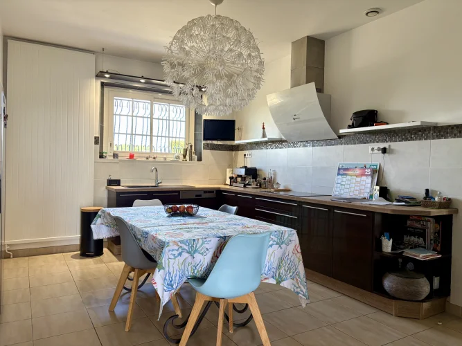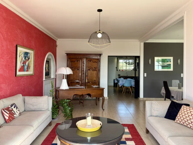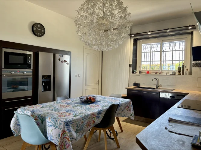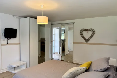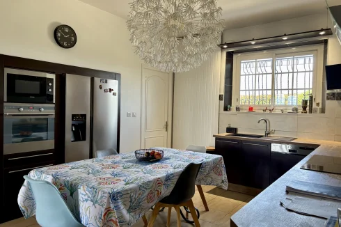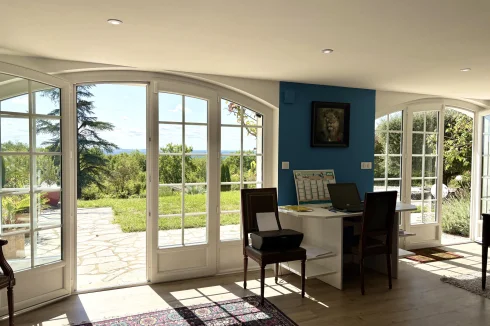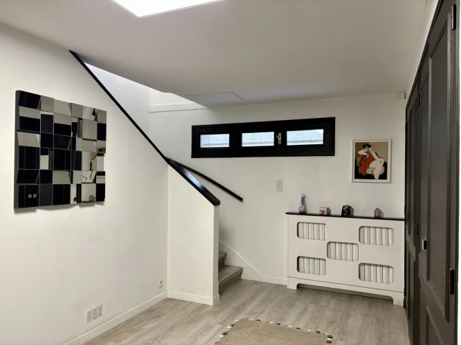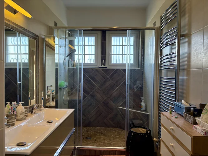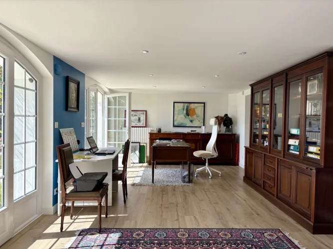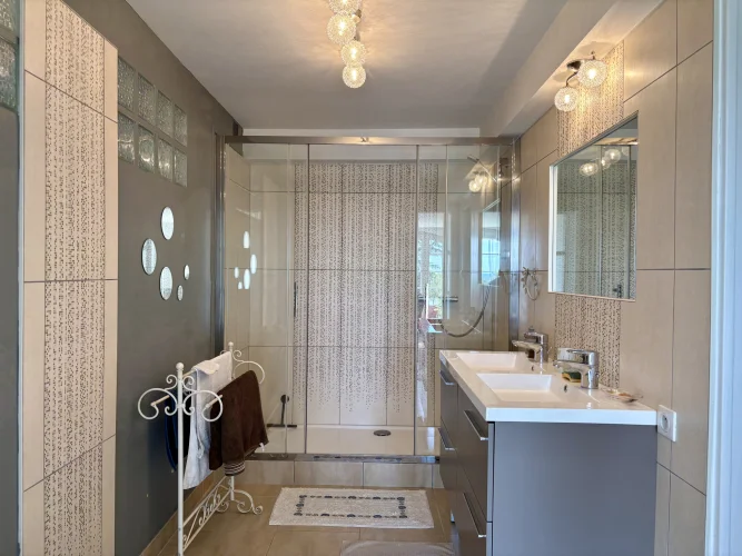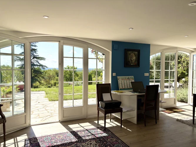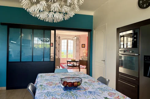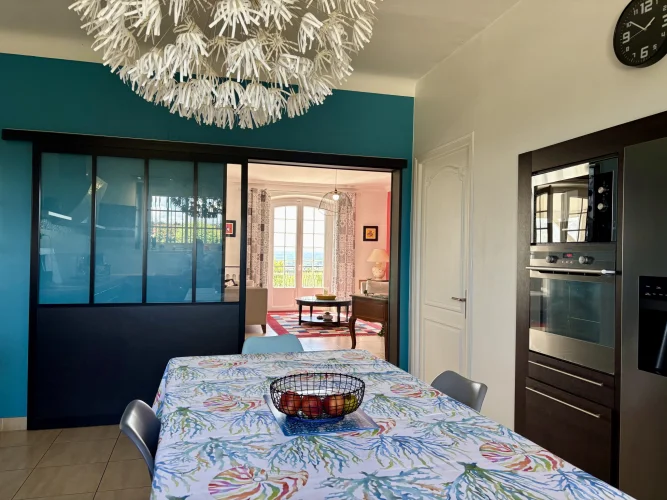 From the moment you enter, charm and elegance are apparent: a spacious hall leads to a beautifully fitted kitchen, extended by a contemporary glass partition opening onto a bright living and dining area. From here, the space flows naturally onto a generous terrace overlooking the garden, perfect for relaxation. Wide steps lead down to the outside, where the pool is surrounded by a carefully landscaped garden, a true haven of greenery.